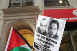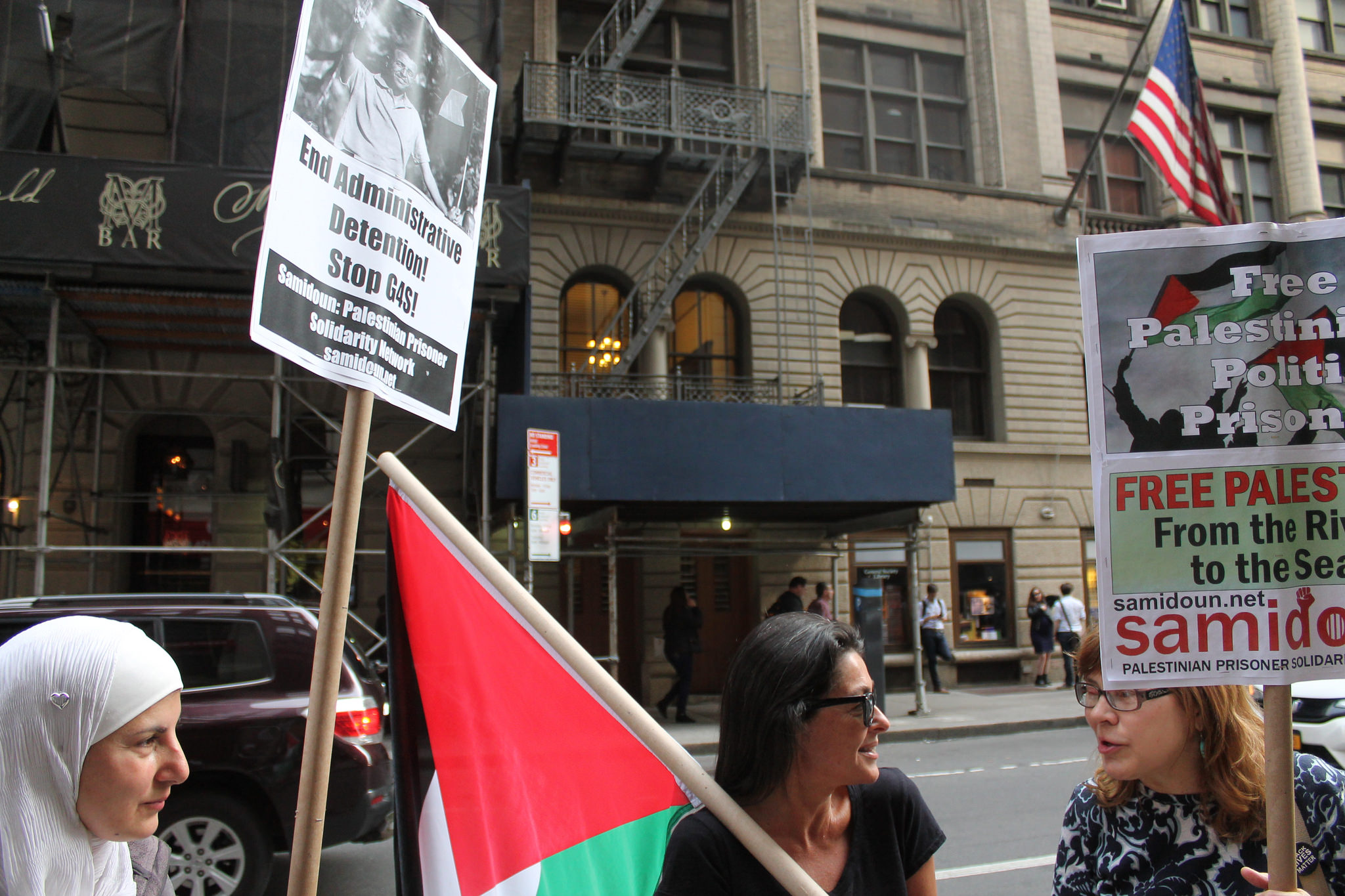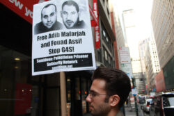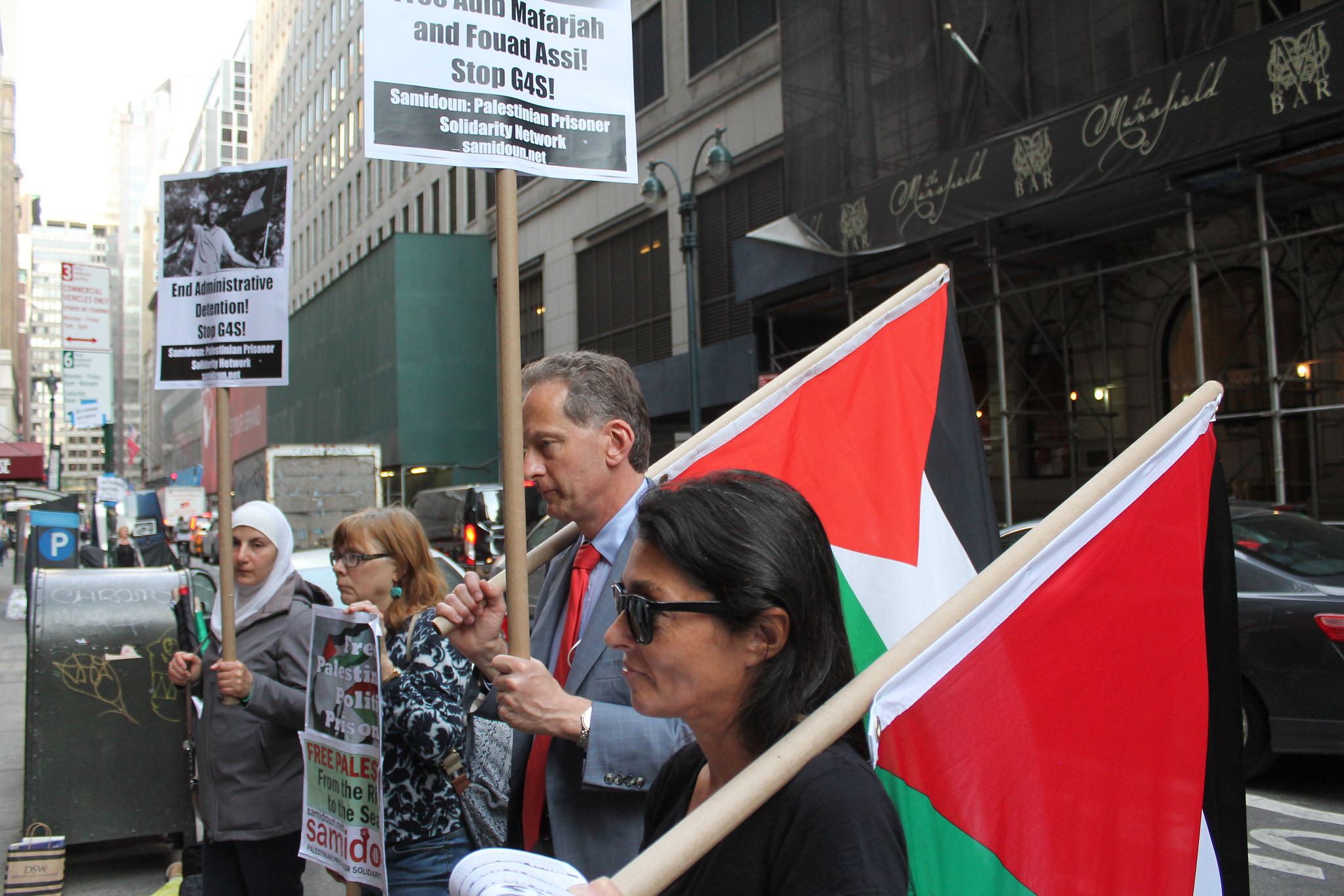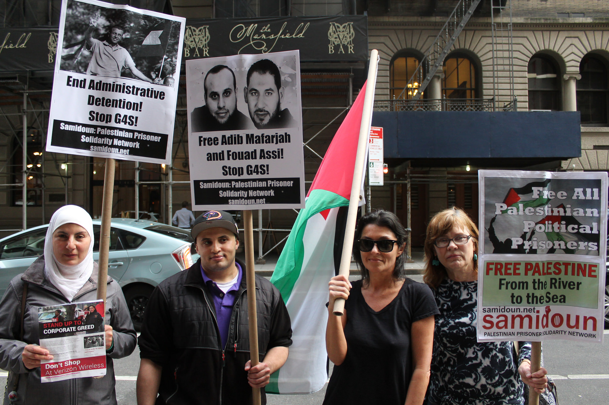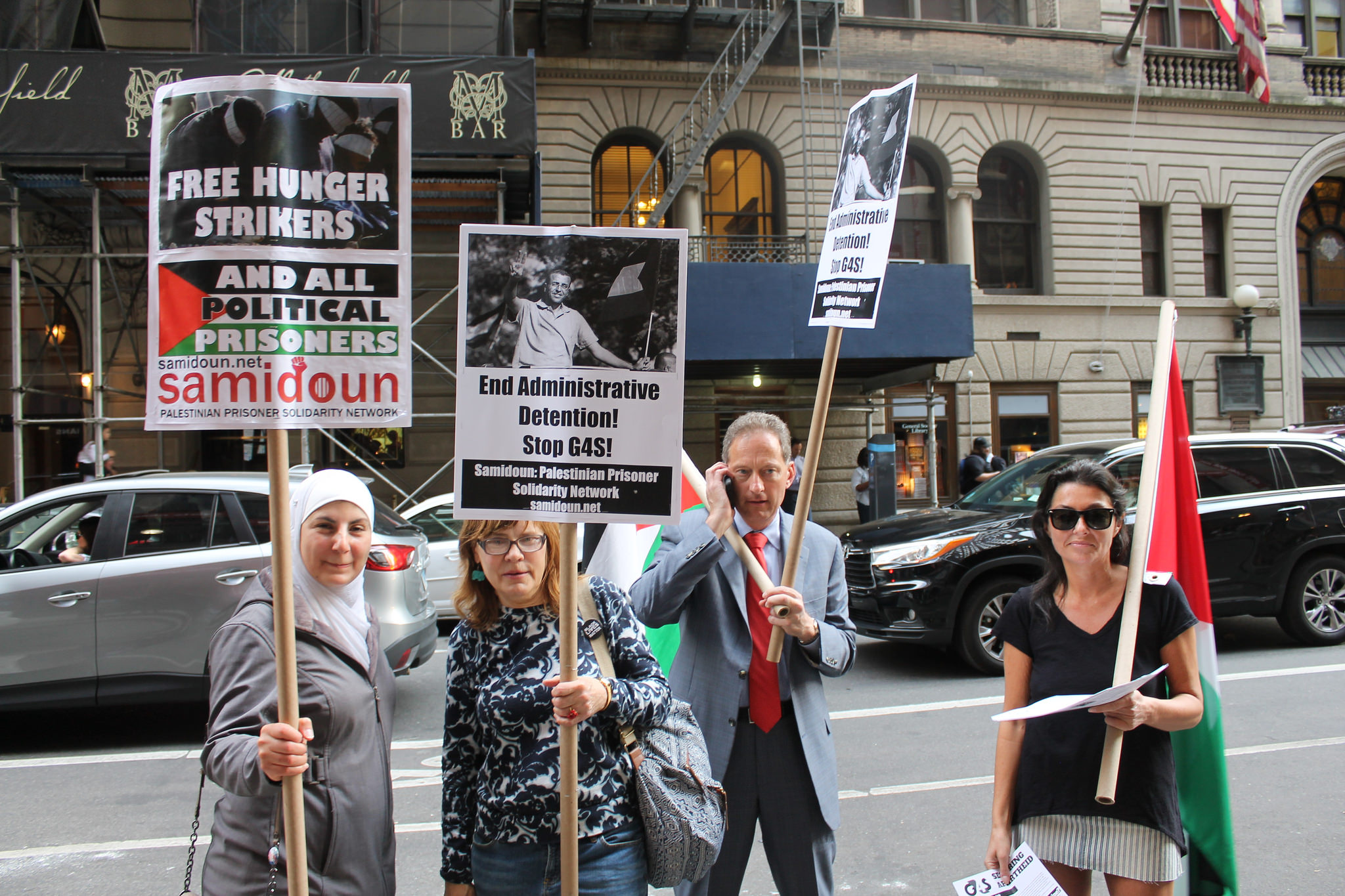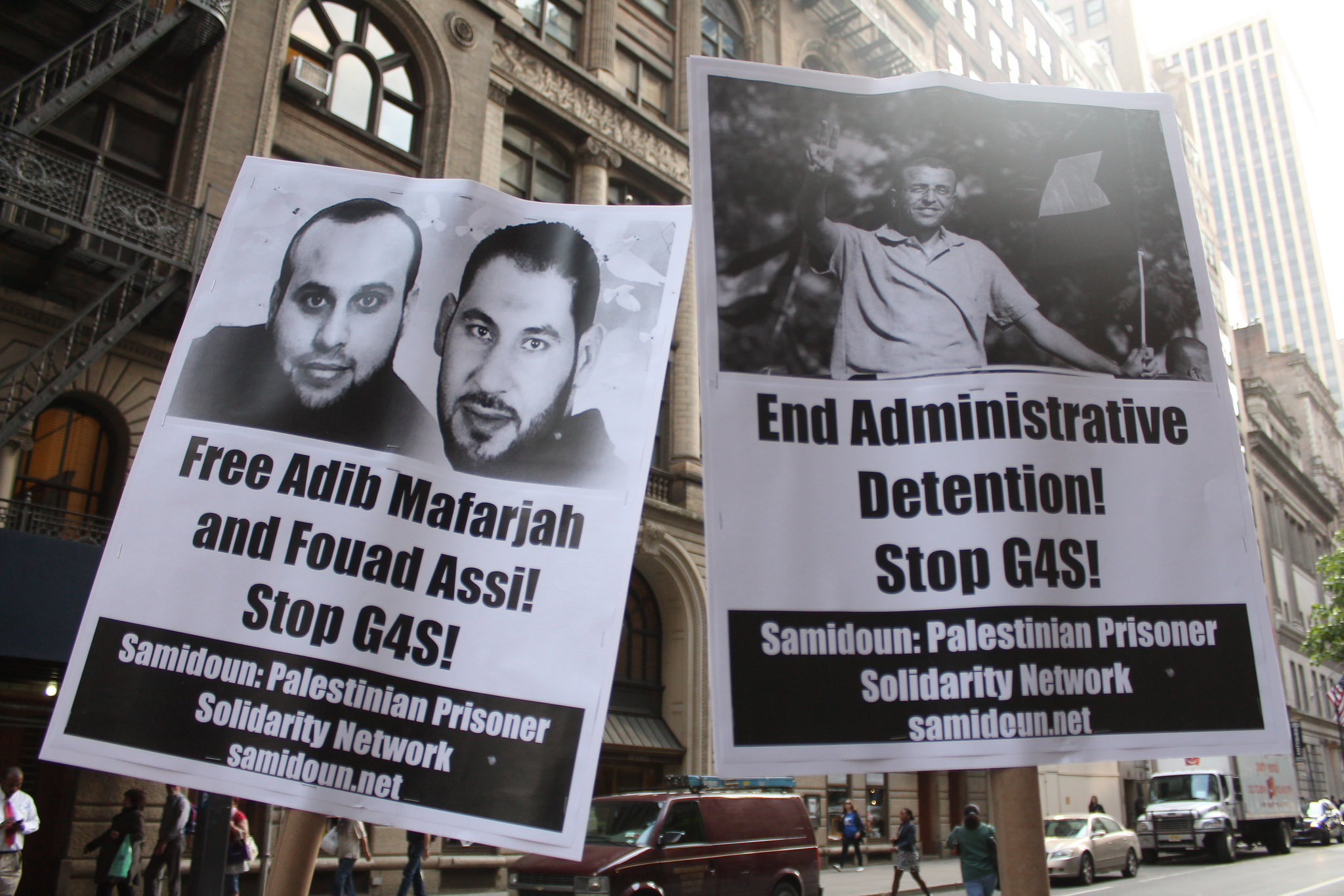 New York City protesters demonstrated on Friday, 20 May outside the local office of British-Danish security conglomerate G4S, a contractor with Israeli Prison Service, to demand that Israel release Adib Mafarjah and Fouad Assi, two Palestinian prisoners on their 48th day of hunger strike against Israeli administrative detention – incarceration without charge or trial under Israeli military orders. They also demanded that G4S end its Israeli contracts, under which the corporation provides security systems, equipment and control rooms to Israeli prisons, checkpoints, police training centers, and even the Erez/Beit Hanoun crossing where the siege of Gaza is enforced.