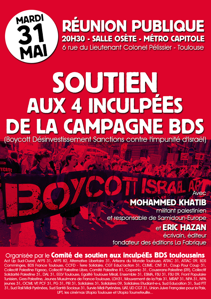 In a letter dated 26 May, the Mayor of Toulouse denied the space rental to Attac France for the meeting, citing the notorious Court of Cassation decision of October 2015 being used to prosecute civil activists urging the boycott of Israel in response to the Palestinian call for Boycott, Divestment and Sanctions. The organizers of the meeting, Attac and the Comité de Soutien aux inculpéEs BDS toulousains, will seek an injunction to allow use of the meeting space in administrative court on Monday; the meeting will go on, whether in the room itself or as a public rally in the street, organizers vowed.