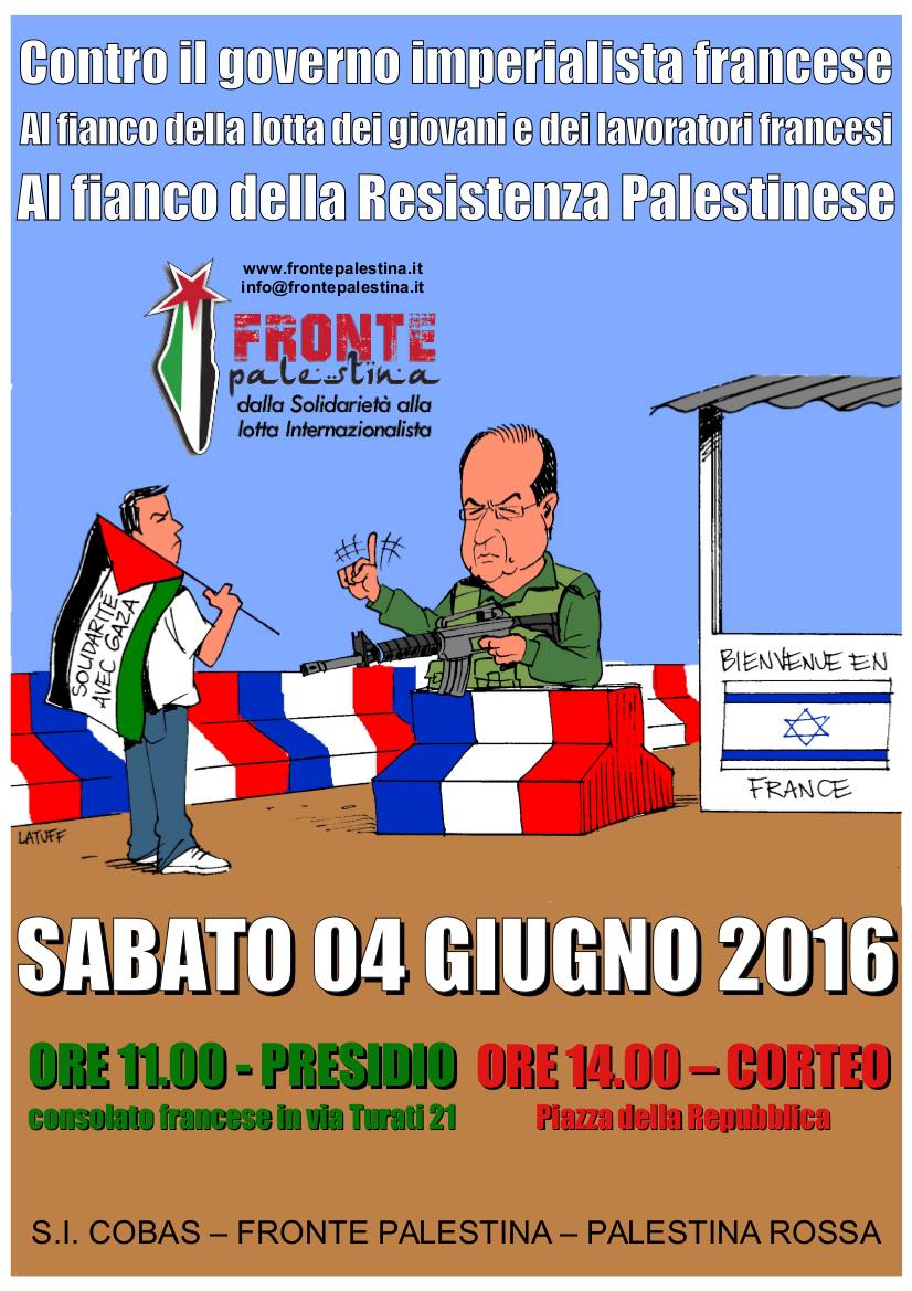 Fronte Palestina and Palestina Rossa will respond to the Palestinian call to mobilization and action against the so-called “French initiative” and to defend the Palestinian right to return at a day of demonstrations and actions on 4 June. This event comes in conjunction with actions by independent trade union SI Cobas, in solidarity with French workers and their struggle against the new labor law being imposed by the French government.