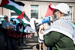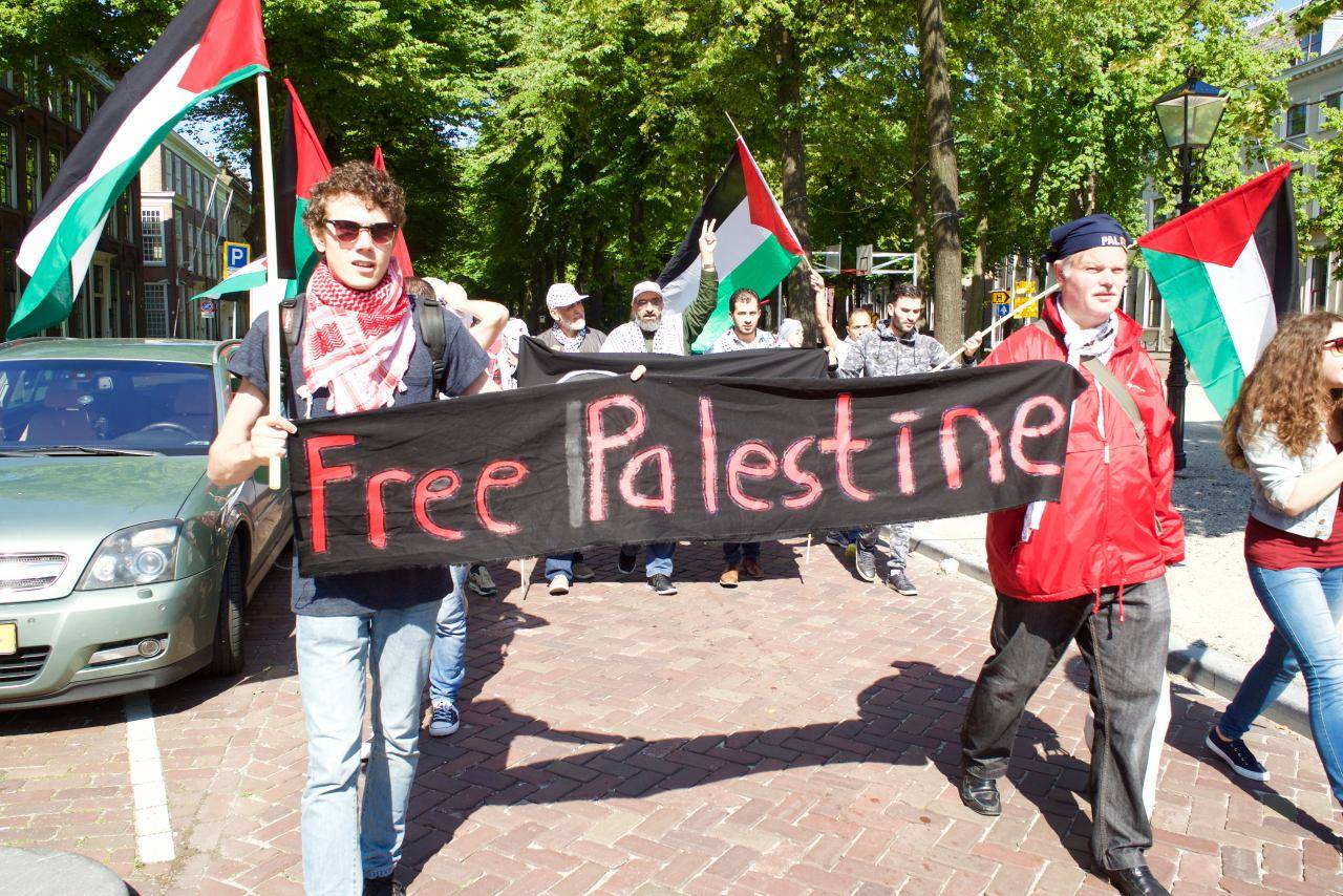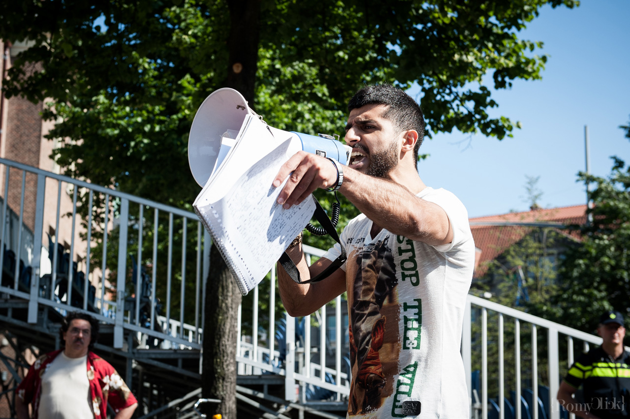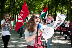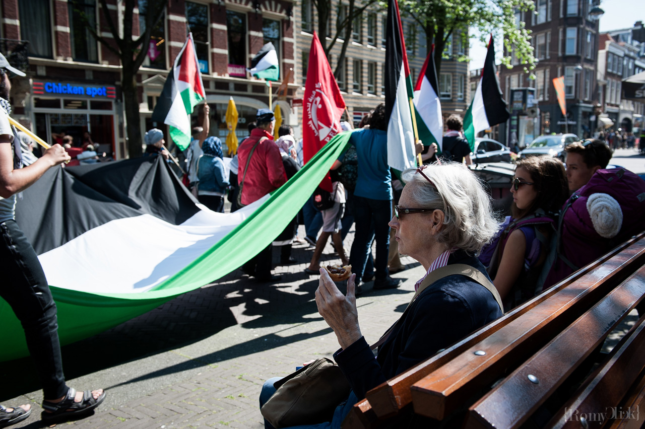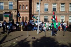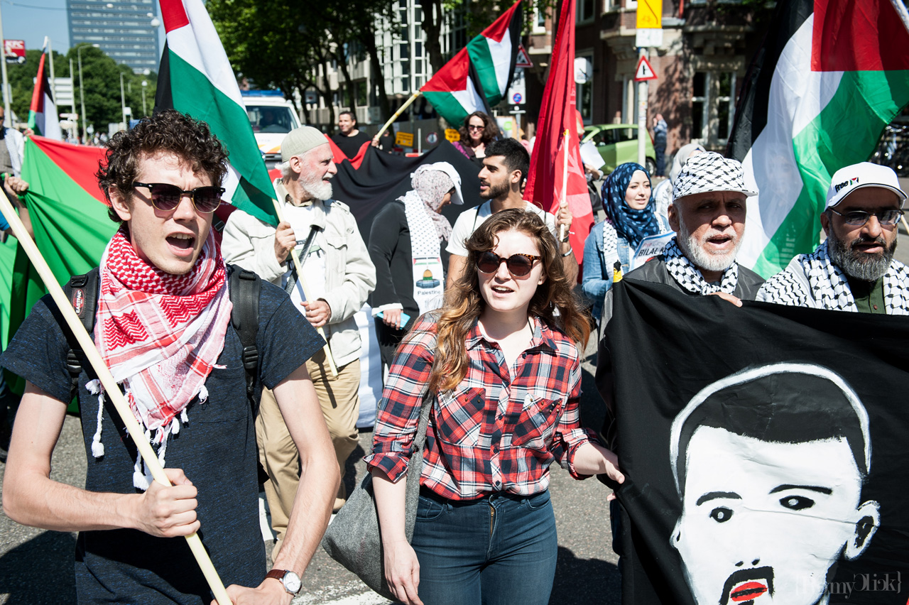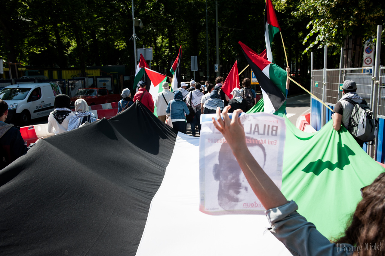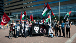 Along the route from the Central Station to the Drees-monument, chants were shouted such as ‘free, free Bilal Kayed’ and ‘geen AOW voor kolonisten’ (‘no state pension for settlers’). Flyers were distributed to bystanders and the message of the protest was spread. Some bystanders spontaneously joined the protest.