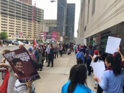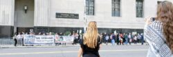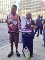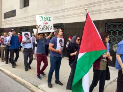 Outside the closed status conference, over 100 Palestinians and supporters from across the Midwest rallied outside the courtroom, chanting and carrying signs and banners demanding Justice for Rasmea. The Rasmea Defense Committee, led by the US Palestinian Community Network and the Committee to Stop FBI Repression, organized with people throughout the Midwest to bring a strong base of support for Odeh.