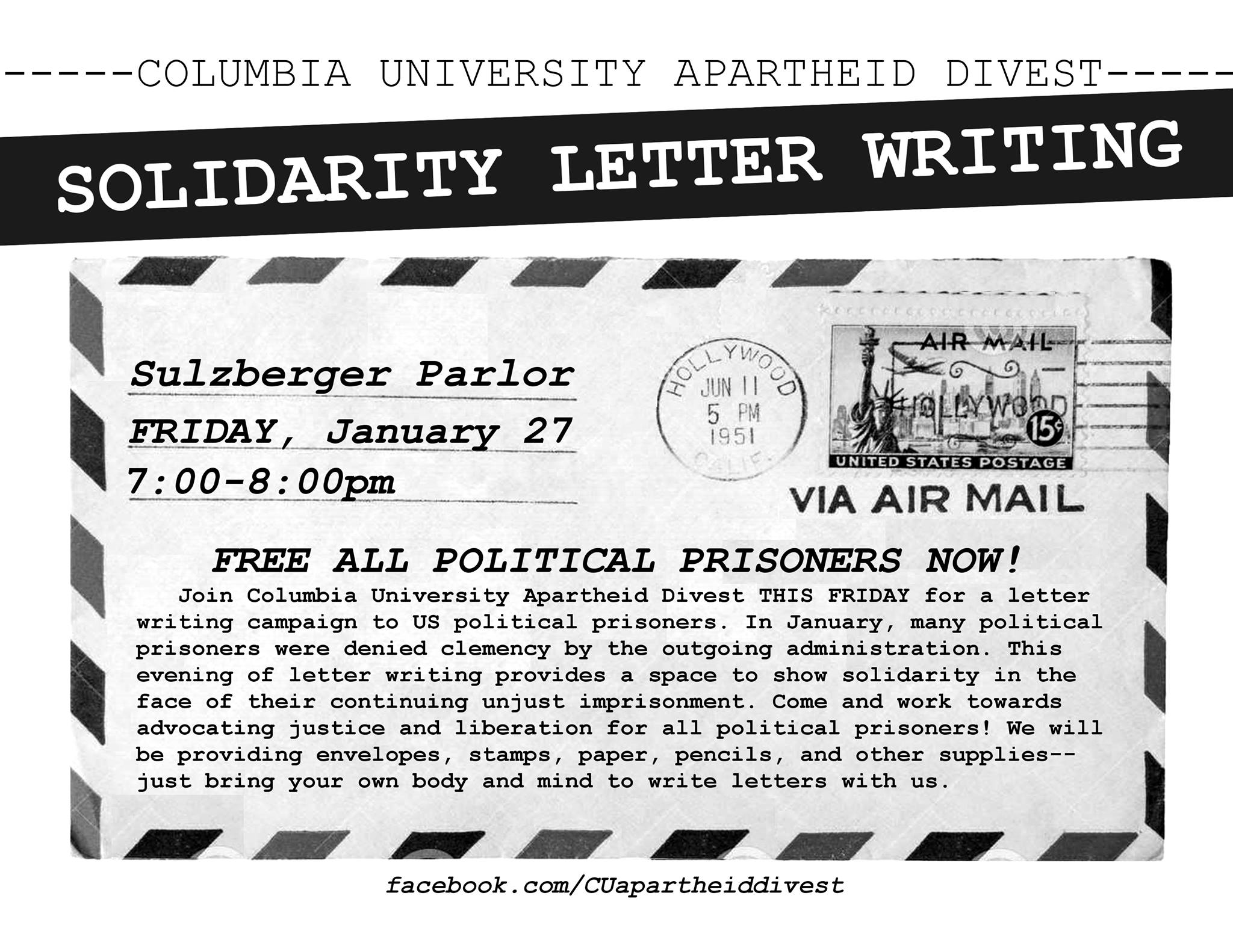 Join Columbia University Apartheid Divest for a letter-writing campaign to US political prisoners. This January, many political prisoners were denied clemency. Join us this Friday for an evening of letter writing campaign to show solidarity in the face of their continuing unjust imprisonment. Join us to work towards freedom for liberation for all political prisoners. We will be providing enevelopes, paper, pencils, and all other supplies – just bring your own body and mind to write letters with us!!