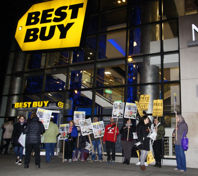 Chants for Palestine rang out in New York City’s Union Square outside the Best Buy electronics store on Friday, 13 January as Samidoun Palestinian Prisoner Solidarity Network protested in solidarity with Palestinian prisoners. The protest, part of the international days of action to free imprisoned Palestinian leader and PFLP General Secretary Ahmad Sa’adat and fellow Palestinian prisoners, also highlighted the growing international boycott of Hewlett-Packard (HP) companies for their role in profiteering from Israeli imprisonment and oppression of Palestinians.