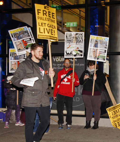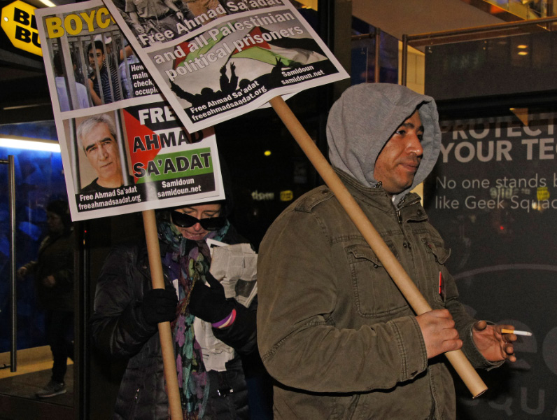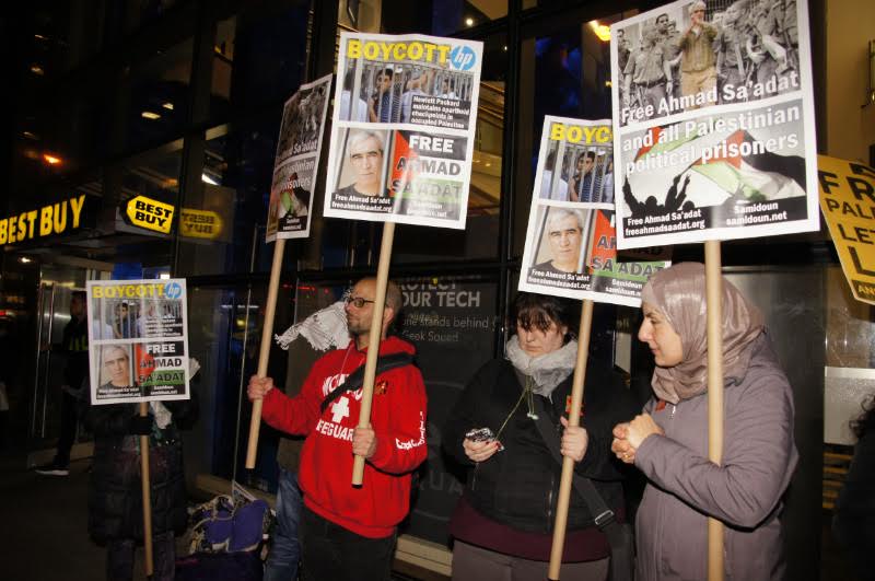 Protesters passed out leaflets to passers-by and chanted “From the river to the sea, Palestine will be free!” and “Free all Palestinian political prisoners” outside the store. Leaflets highlighted the case of Ahmad Sa’adat as well as the campaign to boycott HP products.
