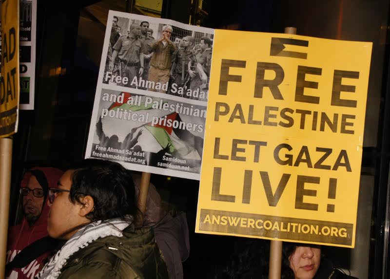 A group from the ANSWER Coalition joined the protest, carrying signs to free Sa’adat and his fellow Palestinian prisoners as well as supporting the Palestinian liberation struggle. ANSWER participants and protesters from the International Action Center discussed plans for anti-war and anti-imperialist protests on 20 January in Washington DC and New York City during the Presidential inauguration of Donald Trump.