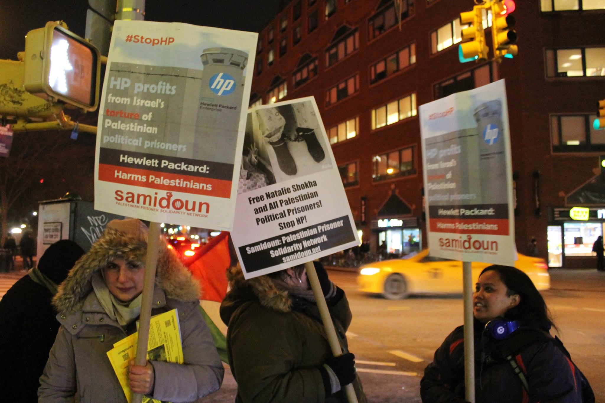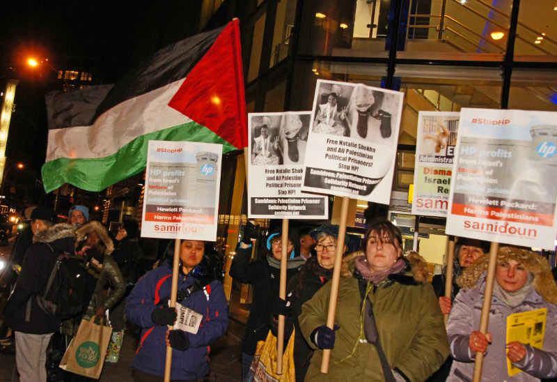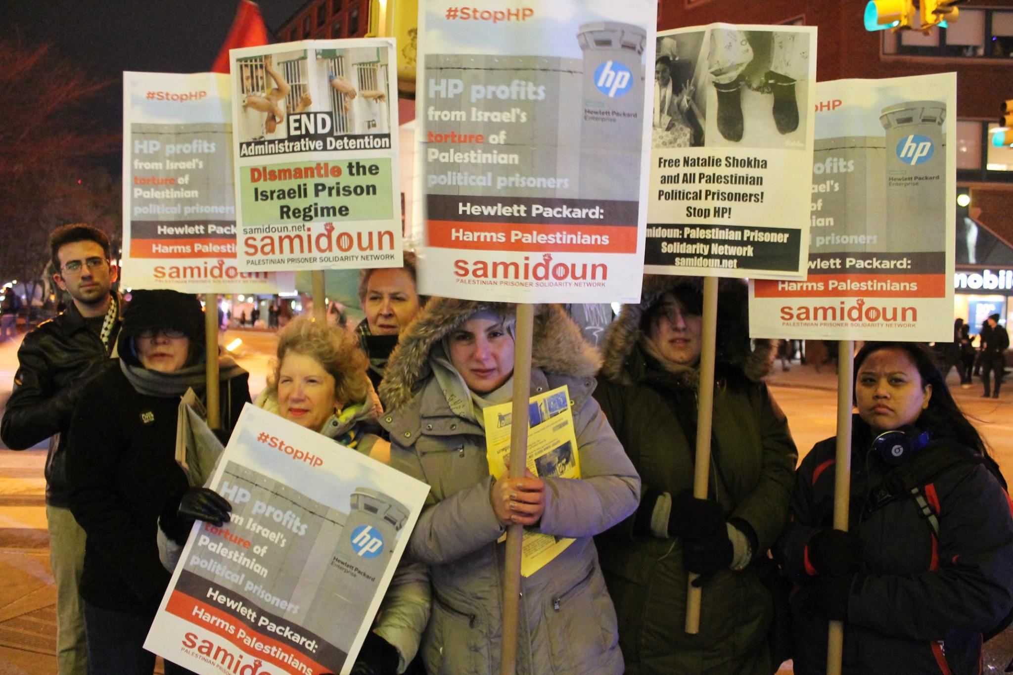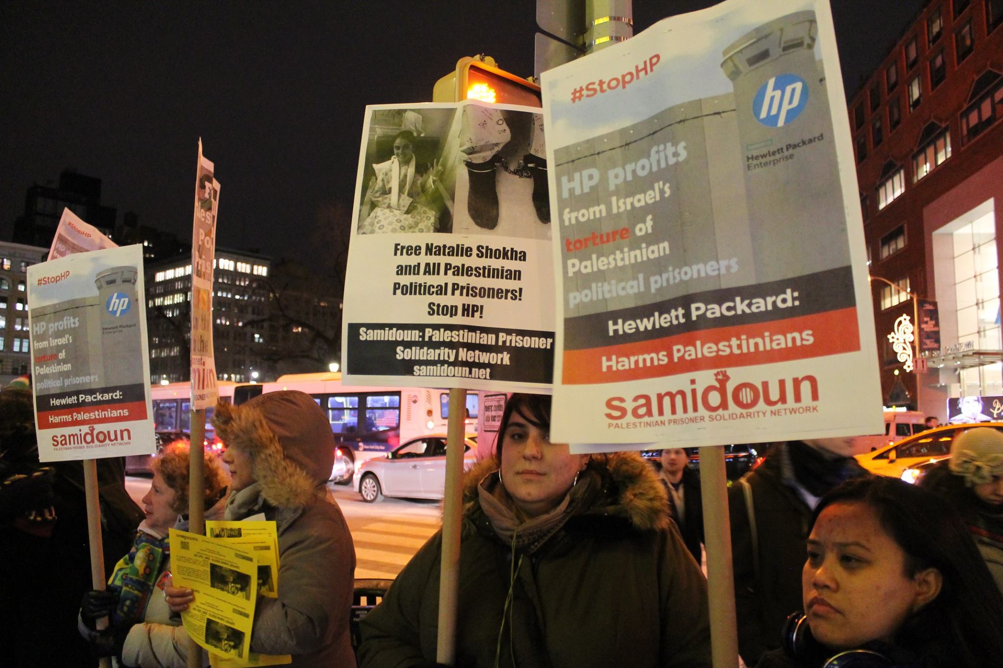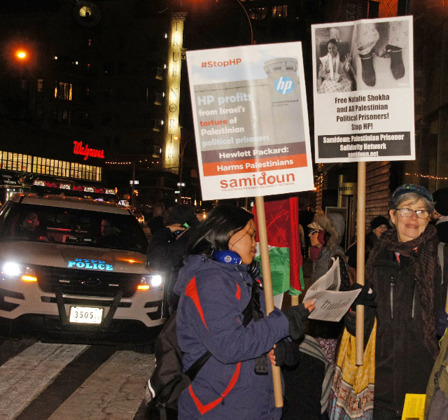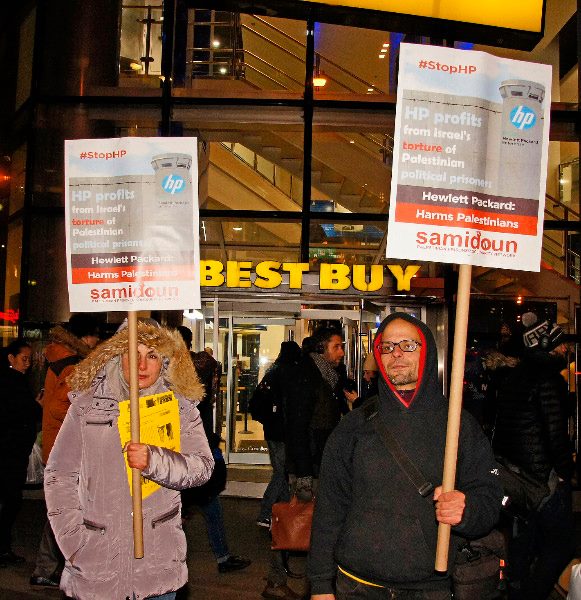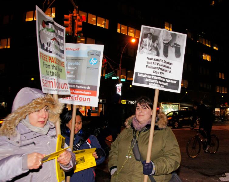 Protesters gathered in New York City outside the Best Buy in Union Square on Friday, 6 January to protest for the freedom of Palestinian child prisoner Natalie Shokha and all Palestinian prisoners. The protest was also organized to highlight the growing international campaign to boycott HP products due to its profiteering from the occupation of Palestine and the imprisonment of Palestinian prisoners.