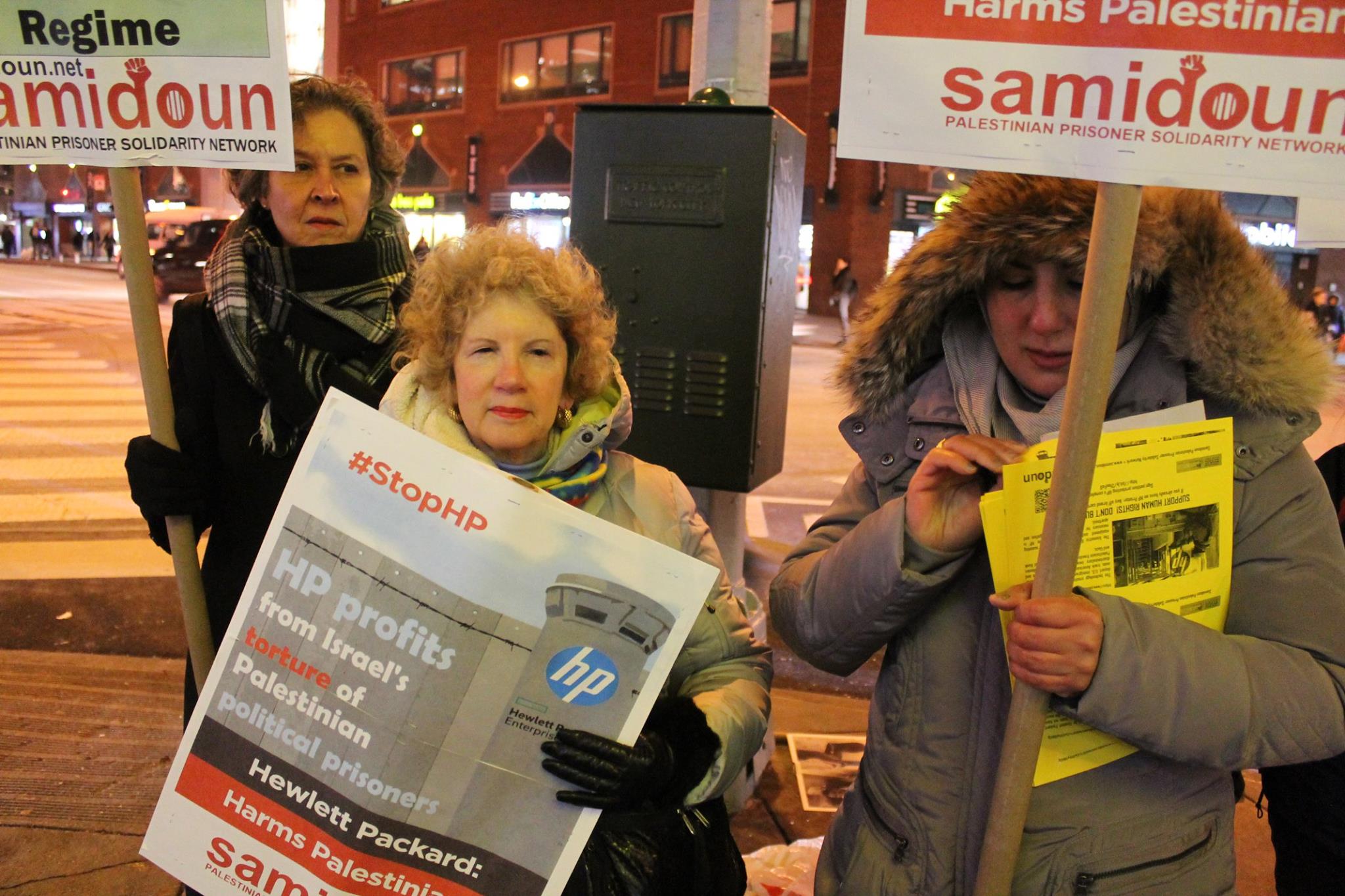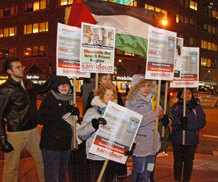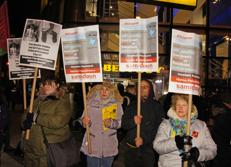 Participants also handed out flyers and materials about the international campaign to boycott Hewlett-Packard computers, printers and other consumer electronics. HP Enterprise has contracts with Israeli prisons and detention centers, occupation and security forces, checkpoints and settlements. It provides technology, equipment and services to the most repressive aspects of the Israeli settler colonial regime.