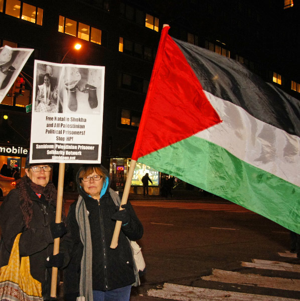 Samidoun Palestinian Prisoner Solidarity Network gathered outside the Best Buy in the wintry cold, carrying signs highlighting the case of 15-year-old Natalie Shokha, recently sentenced to one and one-half years in Israeli prison. Natalie was shot by occupation soldiers on 28 April with live bullets in her back and chest and accused of attempting to stab Israeli soldiers. She is one of over 300 Palestinian children currently imprisoned in Israeli jails.