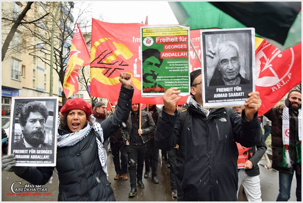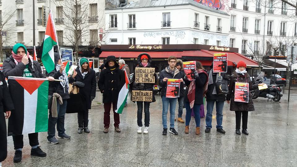 In Paris, France, a number of organizations, including the Unified Campaign to Free Georges Ibrahim Abdallah, gathered to demonstrate at Ménilmontant Metro station. Protesters carried Palestinian flags and signs demanding freedom for Sa’adat and Georges Ibrahim Abdallah, imprisoned in French prisons for 32 years.
