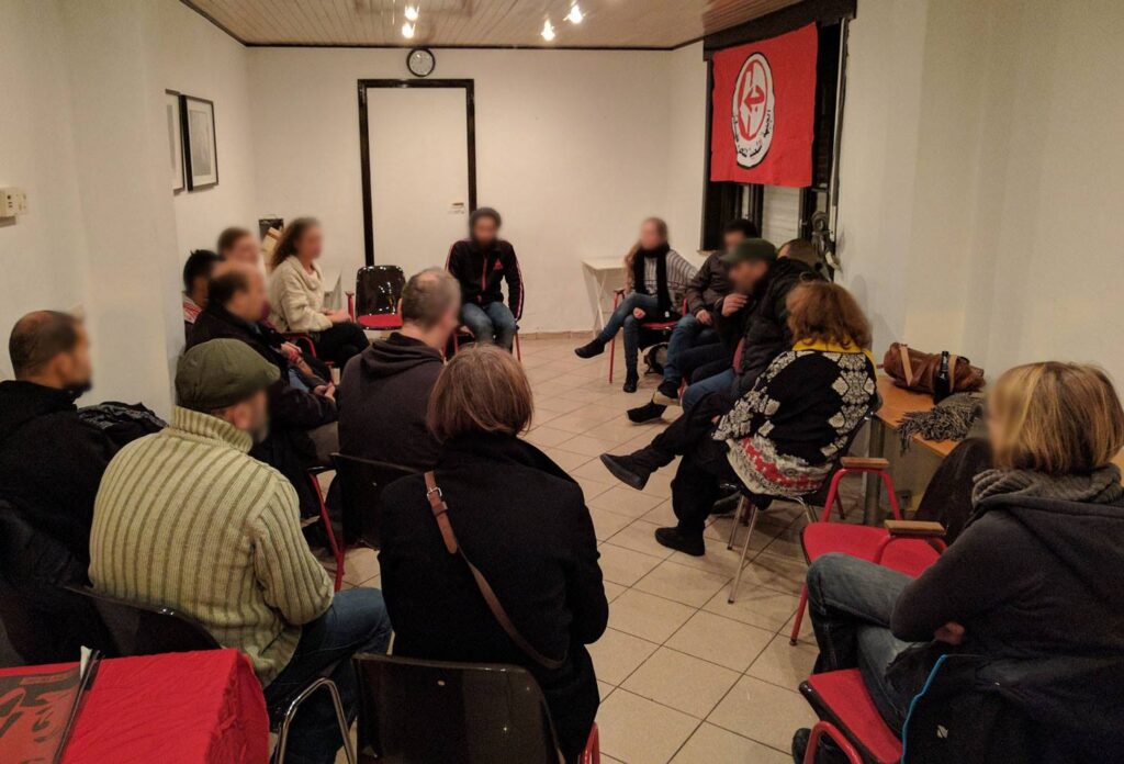 In Brussels, Belgium, Secours Rouge and Samidoun Palestinian Prisoner Solidarity Network held a workshop and discussion on Ahmad Sa’adat and the struggle to free Palestinian prisoners at the new Local Sacco-Vanzetti organizing space. Khaled Barakat of the Campaign to Free Ahmad Sa’adat and Charlotte Kates of Samidoun spoke about the prisoners’ struggle and a video interview of Sa’adat was screened.