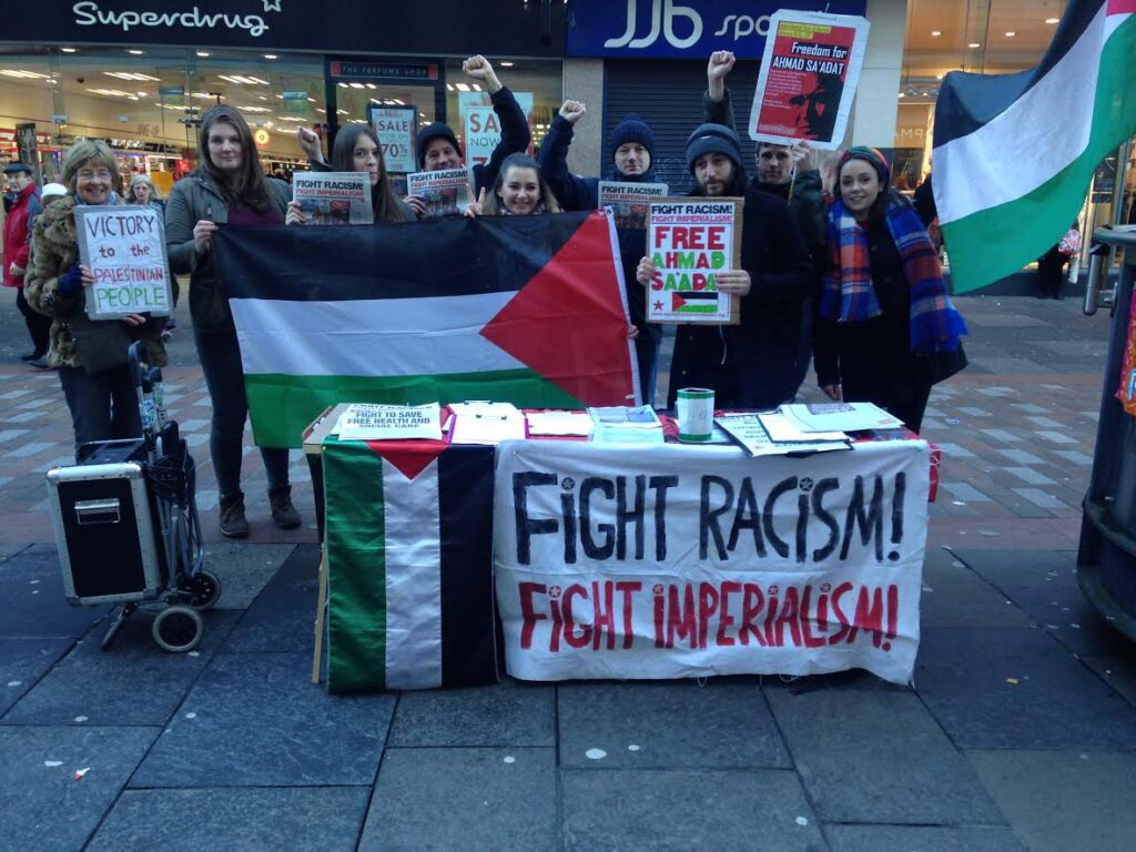 In Glasgow, Scotland, Revolutionary Communist Group activists and friends of éirígí set up an information table and displayed banners and Palestinian flags calling for freedom for Ahmad Sa’adat and fellow Palestinian prisoners. They chalked the streets and spoke through a megaphone, distributing information, and also joined Scottish Palestine Solidarity Campaign protesters outside Barclays bank demonstrating against its investments in Israeli military technology.