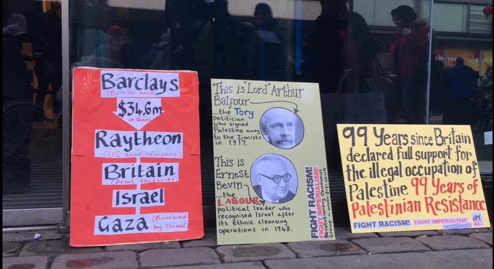 In Manchester, England, Boycott Israel Group activists picketed Barclays bank on Market Street, demanding freedom for Palestinian prisoners and urging the boycott of Barclays bank for its investment and profiteering from British and Israeli war technology.