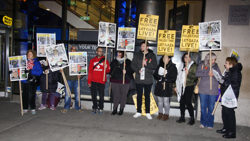 In New York City, Samidoun Palestinian Prisoner Solidarity Network organized a protest outside the Best Buy in Union Square, demanding freedom for Sa’adat and building the boycott campaign against Hewlett-Packard (HP); HP companies profit from the oppression and imprisonment of Palestinians and are subject to a global boycott campaign.