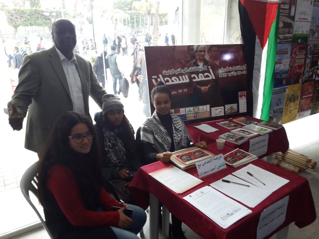 In Tunis, Tunisia, the Palestine Land Studies Center organized an exhibition and information table on 13 and 14 January about Ahmad Sa’adat, the Palestinian prisoners and Palestine as part of the Tunisian Forum for Economic and Social Rights. Activists provided information about the struggle of Palestinian prisoners.
