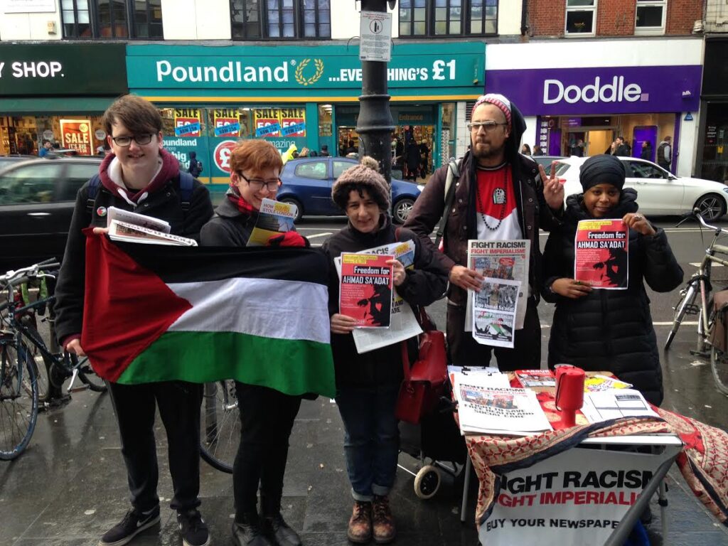 In London, Revolutionary Communist Group and Samidoun supporters organized two actions to demand freedom for Sa’adat and his fellow Palestinian prisoners. In Brixton, South London RCG held a street meeting, distributing literature and raising awareness about the campaign to free Palestinian prisoners.
