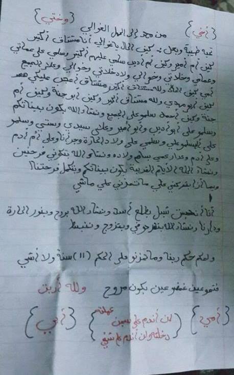 Good greetings, how are you my dearest ones? I miss you very much. How is Amir’s mother? How are you doing? Please greet on my behalf all of my aunts and my uncles, and the children of my aunts and my uncles, and everybody. Mom, how are you? I miss you a lot and I miss teasing you a lot. How is Mahdi? I miss them. And how is Abu Jana and Um Jana? Say hello to everybody and insh’allah I will soon be amongst you. Say hello to Abu Adib and Abu Amir and my grandmother and grandfather and greet everyone who greets me back, the boys in the neighborhood, the neighbors, Um Adam, Adam, my uncle Bassam and his children. I hope you all are happy. God willing, I will be with you in the near days and our happiness will be complete. Mom, I want you to count on me and please don’t be sad, OK?