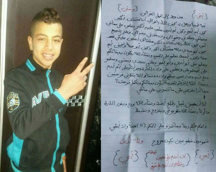 Palestinian child prisoner Mohammed Taha, 16, sent the following letter to his family from Israeli prison, where he is serving an 11-year sentence. A Palestinian refugee from Jerusalem’s Shuafat refugee camp, Mohammed is one of a number of Palestinian children – especially Palestinian Jerusalemites – serving lengthy sentences in Israeli jails.