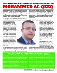 1. Sign and share the public petition to international officials to demand they take a stand on administrative detention and Mohammed al-Qeeq’s imprisonment. Sign and share at: https://www.change.org/p/council-of-the-european-union-take-action-to-free-hunger-striking-palestinian-journalist-mohammed-al-qeeq