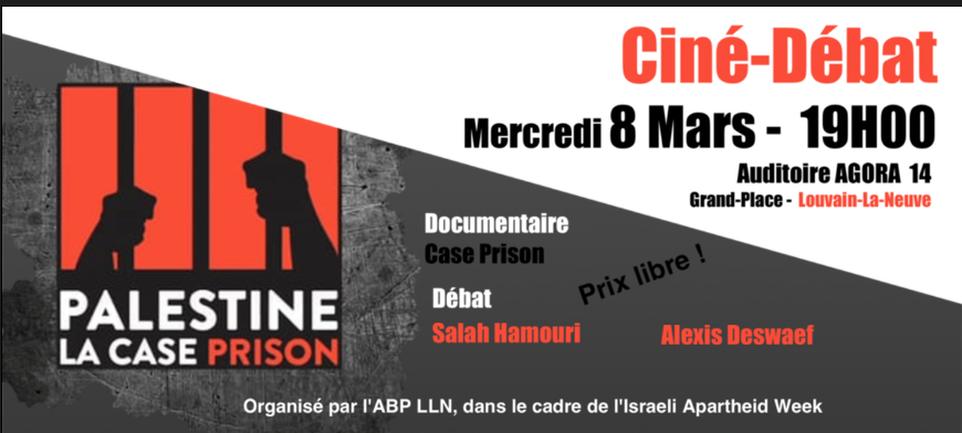 As part of the international “Israeli Apartheid Week” organized in over 200 cities and universities around the world, the Association Belgo-Palestinienne Louvain-la-Neuve invites you to join a film screening and discussion on the topic of prisons in Israel. The politics of imprisonment in Israel is also an important issue due to the complicity of Belgium via the “LAW-TRAIN” program.