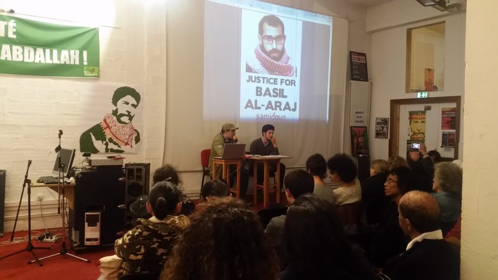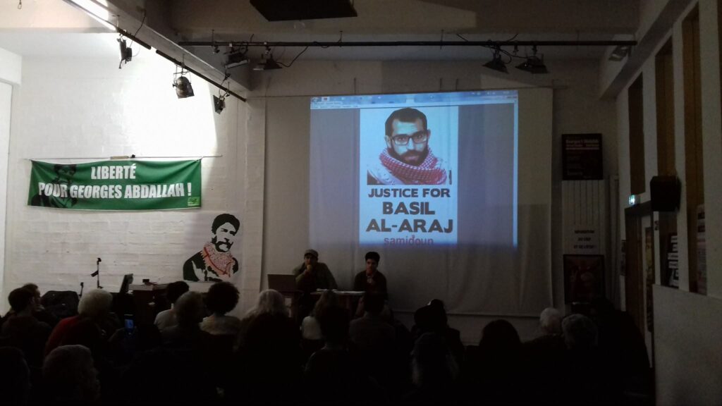 In the evening public event that concluded the meeting, a packed room at Librairie Résistances saluted Abdallah and his fellow prisoners. A number of speakers from committees working to free Georges Abdallah spoke at the event, which also included several videos reviewing Abdallah’s story, including one produced by Secours Rouge in Brussels, and the international advocacy for his freedom.