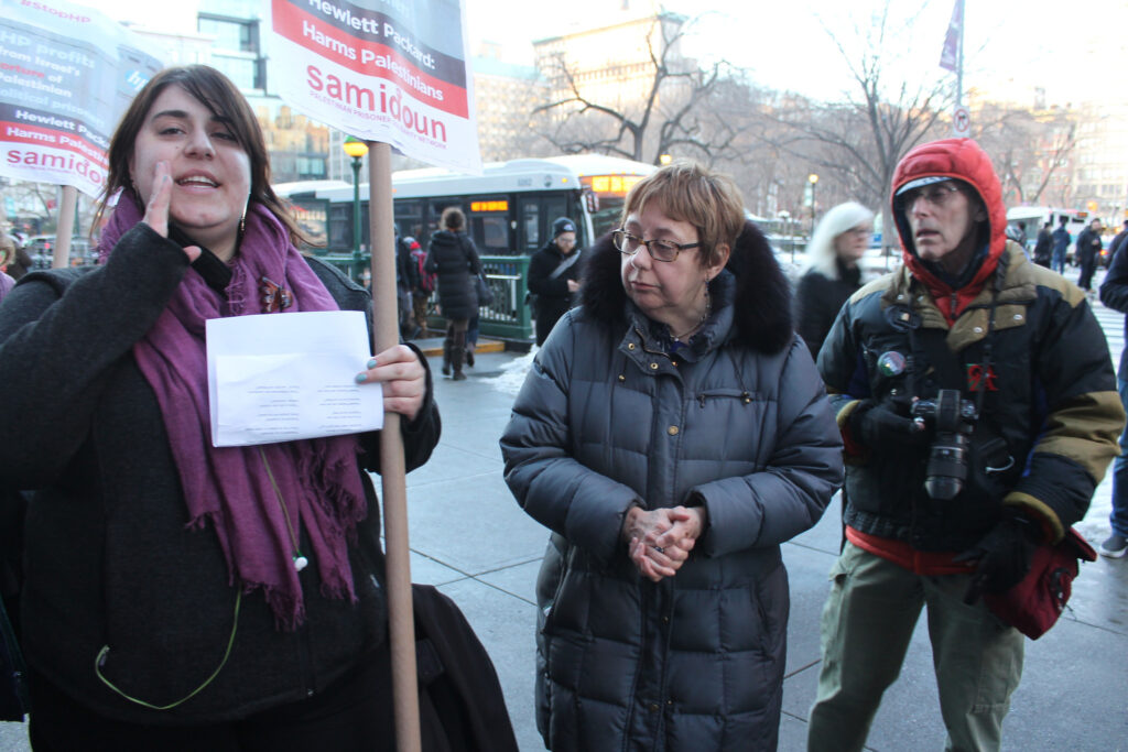 The New York protest was organized by Samidoun Palestinian Prisoner Solidarity Network. Organized outside the Best Buy electronics store, demonstrators called for the boycott of Hewlett-Packard (HP) products and for HP corporations to end their involvement and complicity in Israeli apartheid, occupation and settler colonialism. HP corporations are contracted by the Israeli state to create databases and other technologies for checkpoints, biometric ID cards and the Israel Prison Service, among others. There is a growing international campaign for the boycott of HP until the corporation cuts its complicity with Israeli occupation. Unfortunately, however, HP seems to be doubling down on its investment in Israeli apartheid, partnering with the Israeli Ministry of Foreign Affairs and the Jewish National Fund (KKL/JNF) for a “Brand Israel”-promoting photo contest in occupied Jerusalem.