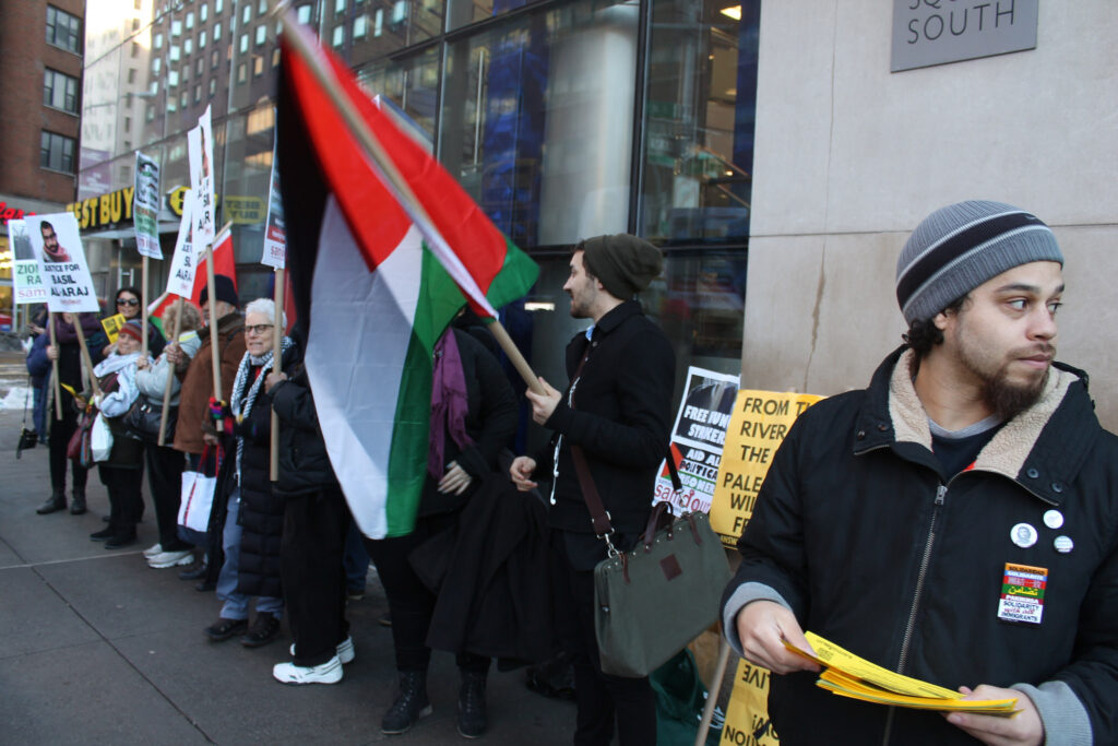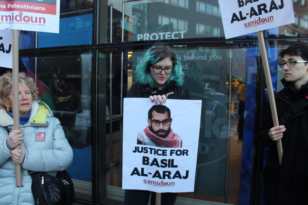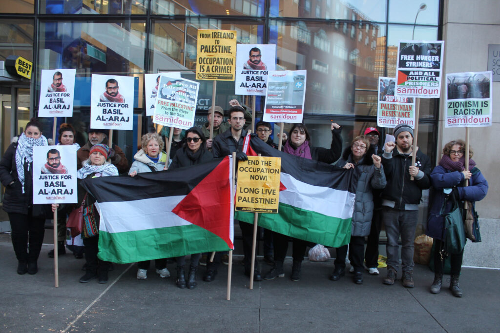 New Yorkers protested on Friday, 17 March outside the Best Buy in Union Square to demand justice for the assassination of Palestinian youth leader Basil al-Araj on 6 March by Israeli occupation forces. The protest coincided with the mass funeral for al-Araj held on the same day in his hometown of al-Walaja, near Bethlehem. Al-Araj’s body had been confiscated and held hostage by Israeli occupation forces for 11 days until it was finally returned to his family; thousands of Palestinians marched in al-Walaja to his burial site.