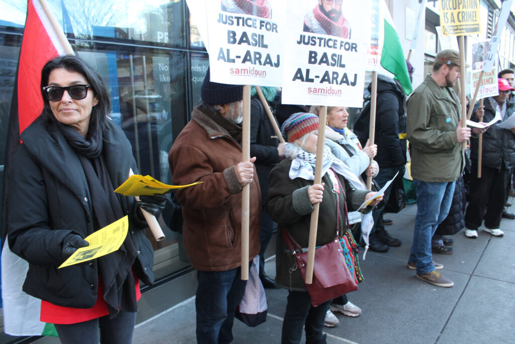 Michela Martinazzi of Samidoun led chants and emceed the rally portion of the protest, when several organizations and individuals presented statements about justice in Palestine and the assassination of al-Araj.