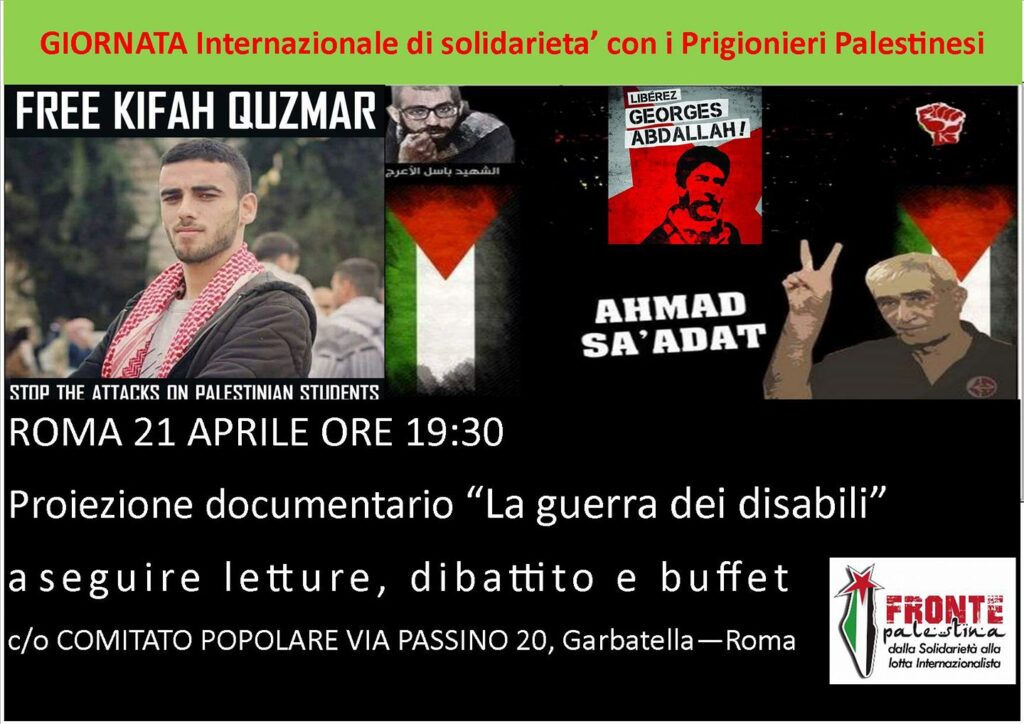 Documentary screening, “The war of disabilities,” followed by a lecture, discussion and buffet. Organized by Fronte Palestina as part of the international days of solidarity with Palestinian prisoners.