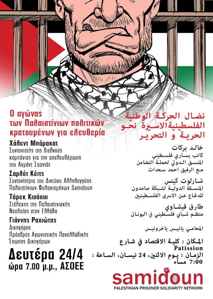 Συμμετέχετε μαζί μας στην συζήτηση για τον αγώνα των Παλαιστινίων πολιτικών κρατουμένων, του Παλαιστινιακού εθνικού απελευθερωτικού κινήματος σήμερα και διεθνή εφησυχασμό στην συνεχιζόμενη καταπίεση του Παλαιστινιακού λαού, με τα εκατομμύρια δολαρίων της αμερικάνικης βοήθεια στο Ισραήλ μέχρι και την φυλάκιση από την Γαλλία του Τζορτζ Ιμπραχήμ Αμπντάλα, Λιβανέζου αγωνιστή για την Παλαιστίνη. Εντωμεταξύ ο Παλαιστινιακός λαός – δίπλα, δίπλα με τους καταπιεσμένους λαούς όλου του κόσμου- συνεχίζει να αντιστέκεται. Παλεύουν ενάντια όχι μόνο στο Ισραηλινό κράτος και μεγάλες ιμπεριαλιστικές δυνάμεις που το υποστηρίζουν αλλά επίσης ενάντια στο “συντονισμό ασφαλείας” της Παλαιστινιακής Αρχής που συνεχίζει να φυλακίζει και να καταπιέζει την Παλαιστινιακή αντίσταση.
