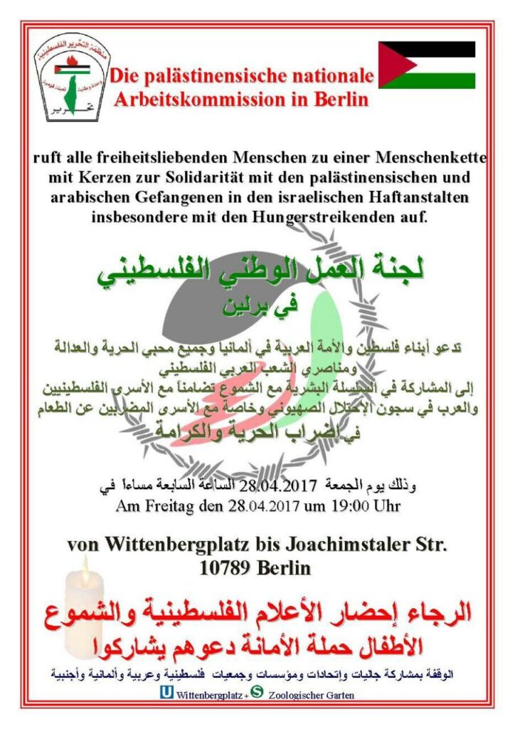 For more information: http://palaestina-solidaritaet.de/2017/04/26/berlin-sa-29-04-2017-menschenkette-in-solidaritaet-mit-den-palaestinensischen-und-arabischen-gefangenen/