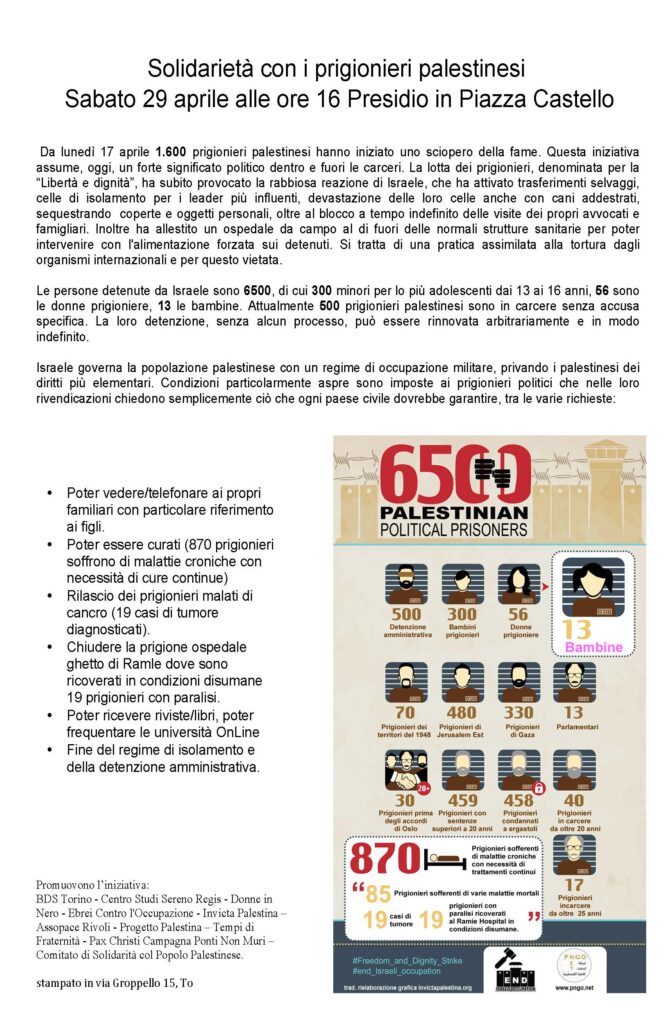 Join the protest in solidarity. Organized by BDS Torino, Centro Studi Sereno Regis, Donne in Nero, Ebrei Contro l’Occupazione, Invicta Palestina, Assopace Rivoli, Progetto Palestina, Tempi di Fraternita, Pax Christi Campagna Ponti Non Muri, Comitato di Solidarita col Popolo Palestinese