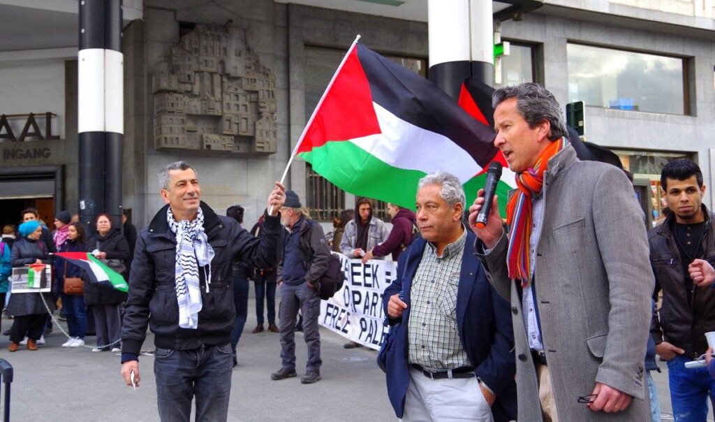 Dirk DeBlock, a councillor with the Workers Party of Belgium in Molenbeek and several community activists from Molenbeek also spoke at the protest. Molenbeek, one of the 19 communes that makes up the city and region of Brussels, celebrated a major victory for Palestinian human rights on Wednesday, 26 April when the commune adopted a legally-binding policy prohibiting contracting with businesses and corporations involved with human rights violations, including the Israeli occupation of Palestine, the first Belgian city or town to adopt such a binding initiative.