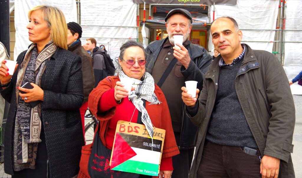 The event included a moving and powerful performance by Raj’een Palestinian Dabkeh Troupe, who performed a modern dabkeh piece illustrating the struggle of Palestinian prisoners as well as a classic dabkeh performance. The strong dancing and Palestinian music drew the attention of many passers-by in the central area of the city. The dabkeh troupe, organized by Palestinian youth in Belgium, performs at cultural and community events across Europe.