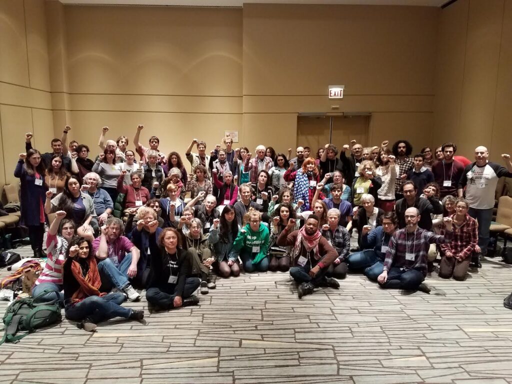 At the Jewish Voice for Peace National Membership Meeting in Chicago, in the United States, Kristian Davis Bailey of Black4Palestine spoke at the plenary on Sunday, 2 April. Over 75 solidarity activists gathered for a group photo to express their solidarity and send their support to Quzmar, demanding his release and that of fellow Palestinian prisoners. Mohammed Khatib of Samidoun was invited to address the same plenary, but was denied a visa to the United States due to his status as a Palestinian refugee in Europe.