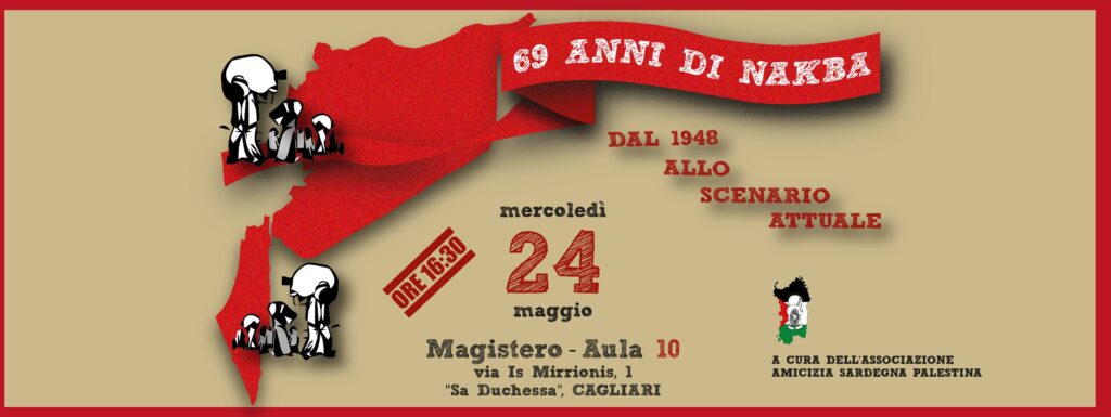 The Associazione Amicizia Sardegna Palestina is organizing a moment of reflection and understanding on the 69th anniversary of the Palestinian Nakba. The catastrophe against the Palestinian people upon the creation of the state of Israel carries heavy consequences for Palestinian refugees in diaspora and all of those in occupied Palestine.