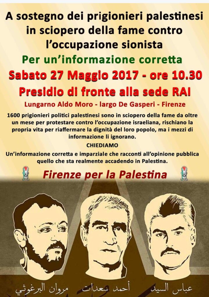 1600 Palestinian political prisoners have been on hunger strike for more than a month to protest the Israeli occupation’s violations of their human rights and demand their human dignity. We will protest and provide information about the strike. We demand that RAI produce correct and impartial information to inform public opinion about the real situation in Palestine.