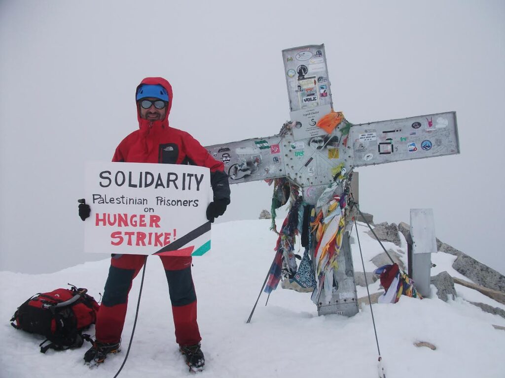 In Spain, climber Carlos Blanca displayed his solidarity with hunger-striking Palestinian prisoners while climbing Aneto Peak, the highest mountain in the Pyrenees, on 17 May.