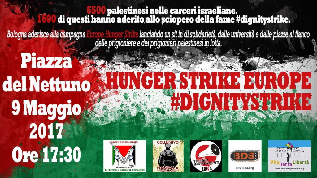 In Bologna, at the university and in the city, we will join the European mobilization for a hunger strike to express our solidarity with 6500 Palestinian political prisoners in Israeli jails, of whom 1600 have launched a hunger strike since 17 April, the #DignityStrike. The prisoners are demanding their fundamental human rights for dignity and freedom, and are facing violence and repression by the regime of colonization, military occupation and apartheid perpetuated by the Israeli state.