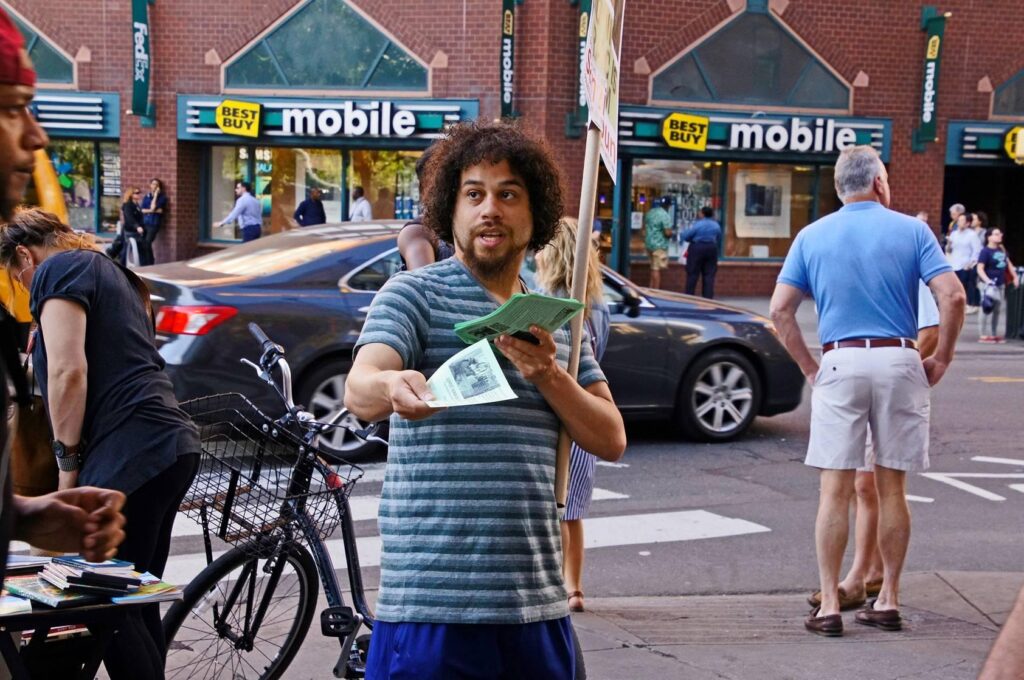 A security guard from Best Buy attempted to demand that the demonstrators leave the front of the store and move across the street, threatening to call the police on the protesters despite their legal right to protest on the sidewalk.