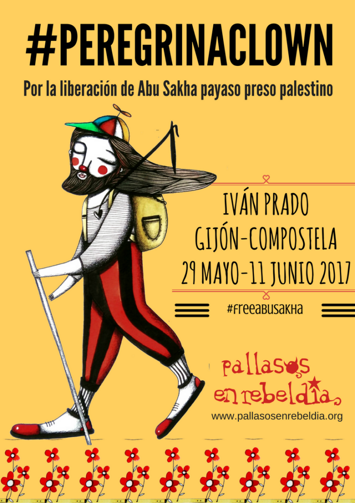 Now, Ivan Prado of Pallasos en Rebeldia is taking a #PeregrinaClown journey from Gijon to Santiago de Compostela, from 29 May to 11 June, performing from city to city and highlighting the case of Mohammed Abu Sakha. Prado is organizing stops, performances and talks in each city along the way, highlighting the case of Abu Sakha and the struggle to end administrative detention.