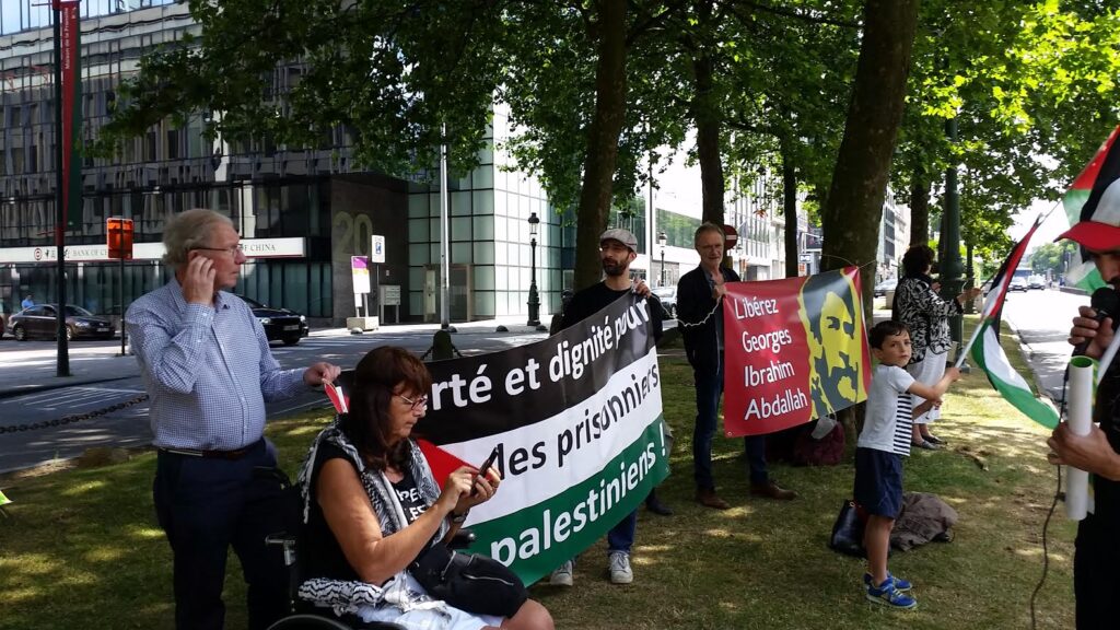 In Brussels, a smaller demonstration was organized on 17 June outside the French Consulate in support of the Paris mobilization. Participants received strong support from cars passing by as they held banners demanding freedom for Georges Abdallah, freedom for Palestinian political prisoners and waved Palestinian flags.
