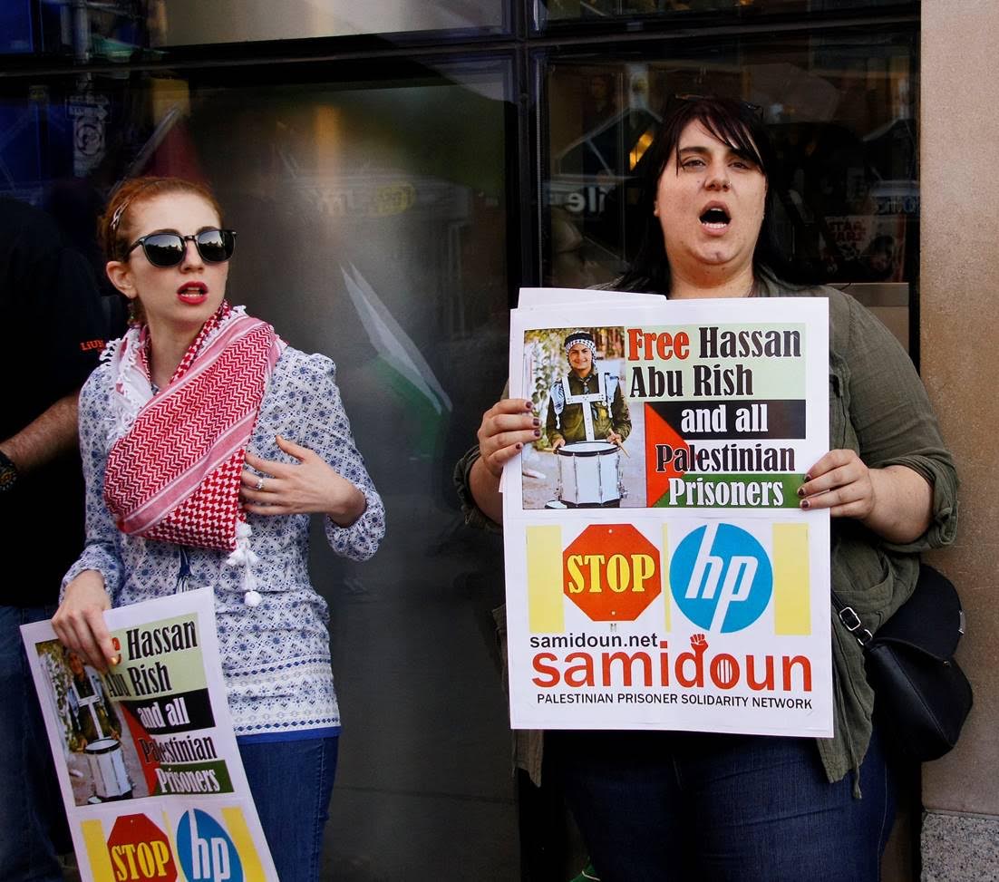 Protesters distributed information about the situation of Palestinian prisoners as well as the involvement of HP in Israeli violations of Palestinian human rights, from the naval siege of Gaza to the imprisonment of thousands of political prisoners.