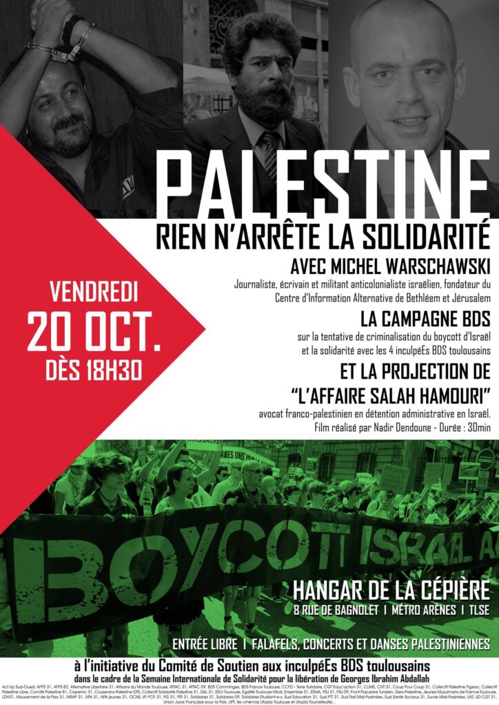 Organized by the Comité de Soutien aux inculpéEs BDS toulousains, part of the international days of resistance from 14-24 October to free Georges Ibrahim Abdallah, imprisoned Lebanese Communist struggler for Palestine, as he enters his 34th year in French prisons.