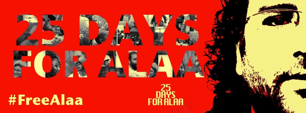 The campaign to Free Alaa is highlighting the case of this jailed struggler from 24 September to 19 October; on 19 October, the appeal hearings will begin in the “Shoura Council” case, in which Alaa and other activists were found guilty of protesting outside the Shoura Council building in November 2013 after peaceful protesters against military trials were attacked with massive police brutality and violence. Alaa was sentenced to five years in prison, of which he has served three and a half; the case is now being appealed to Egypt’s highest court, the Court of Cassation.
