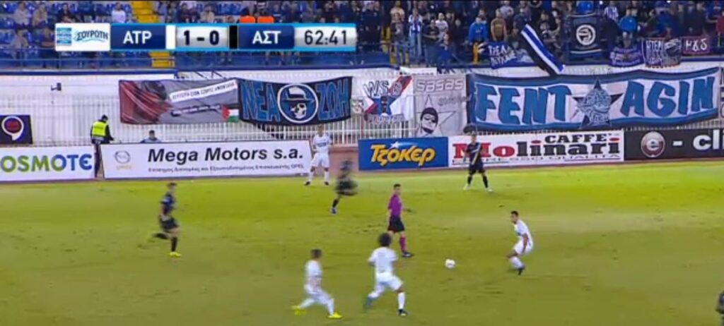 The next event for the Week of Action was an action by the Greek Front of Resistance and Solidarity for Palestine “Ghassan Kanafani”, who raised a banner to free Georges Abdallah on Saturday, 14 October at the football game between Atromitos and Asteras Tripolis at a central spot beside the Atromitos fans.
