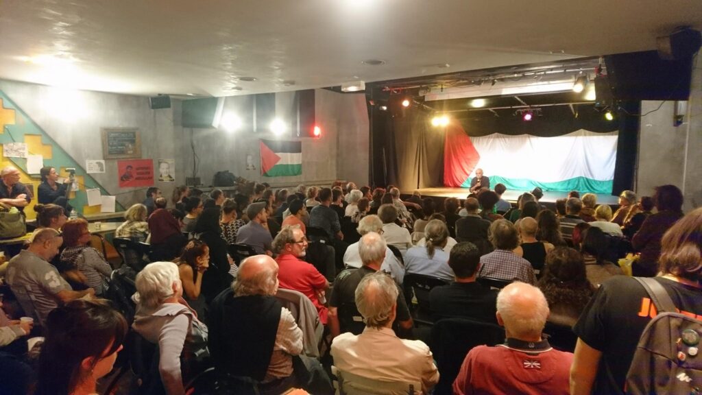 A large event brought out over 160 people in Toulouse on the eve of the mass march in Lannemezan, organized by the Comité de Soutien aux InculpéEs BDS (Committee to Support the Accused BDS Activists). The event included a screening of the Secours Rouge film on Georges Abdallah as well as a speech by Michel Warschawski, journalist, writer and co-founder of the Alternative Information Center. The event was followed by a Palestinian meal and concert.