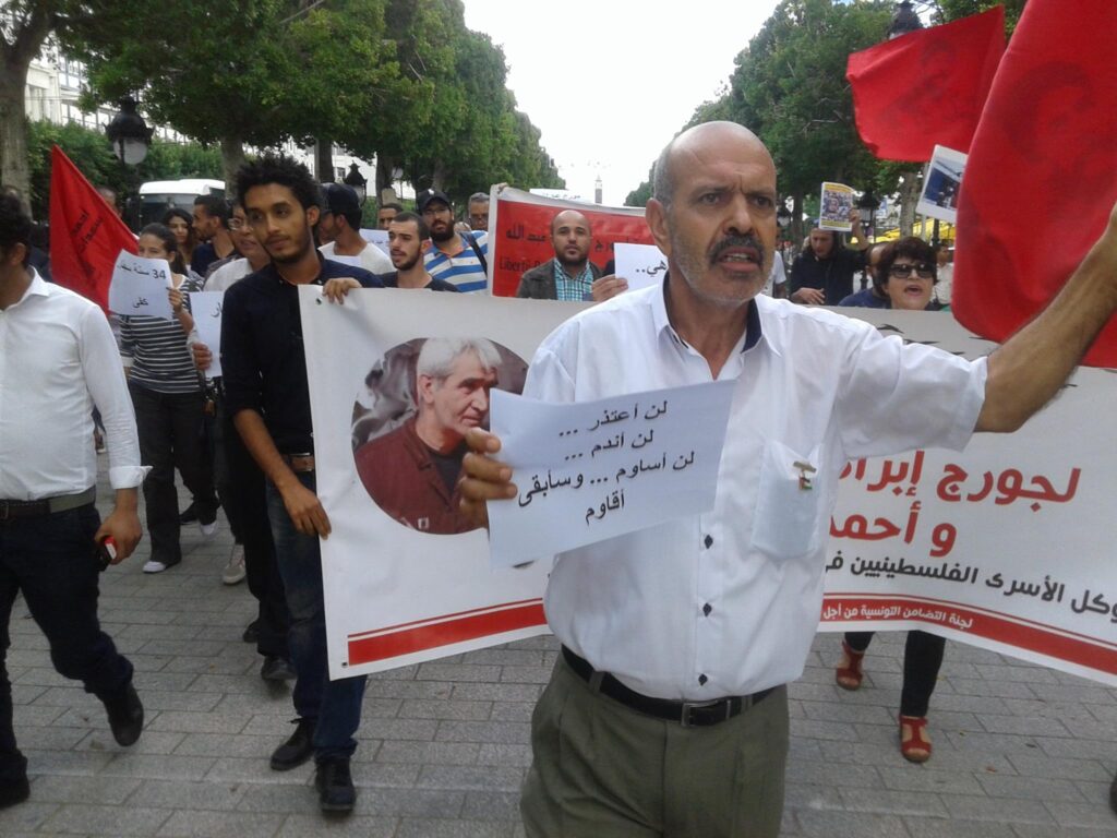The Tunisian Committee for the Liberation of Georges Abdallah organized a protest on Saturday, 21 October. Activists gathered on Habib Bourguiba street to march to the French embassy, led by a banner with images of Georges Abdallah and Ahmad Sa’adat. Tunisian activists spoke and protested, demanding Abdallah’s freedom.