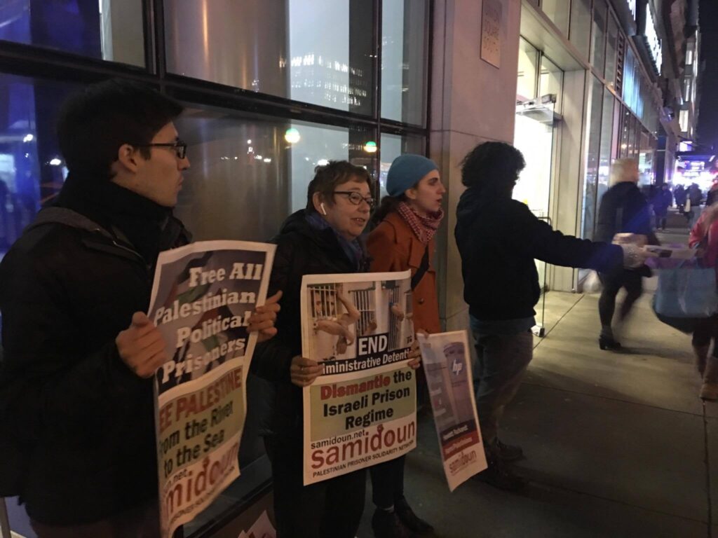 Organized by Samidoun Palestinian Prisoner Solidarity Network, the protest took place in front of the Best Buy electronics store in Manhattan’s Union Square. Protesters carried signs and distributed information about Palestinian prisoners on hunger strike. At the time, four prisoners, Hamza Bouzia, Hassan Shokeh, Bajis Nakhleh and Salah Khawaja, were on hunger strike against their imprisonment without charge or trial. Currently, Bouzia and Khawaja are still on hunger strike to demand their freedom from administrative detention.