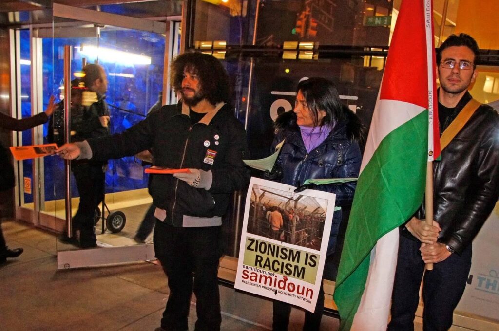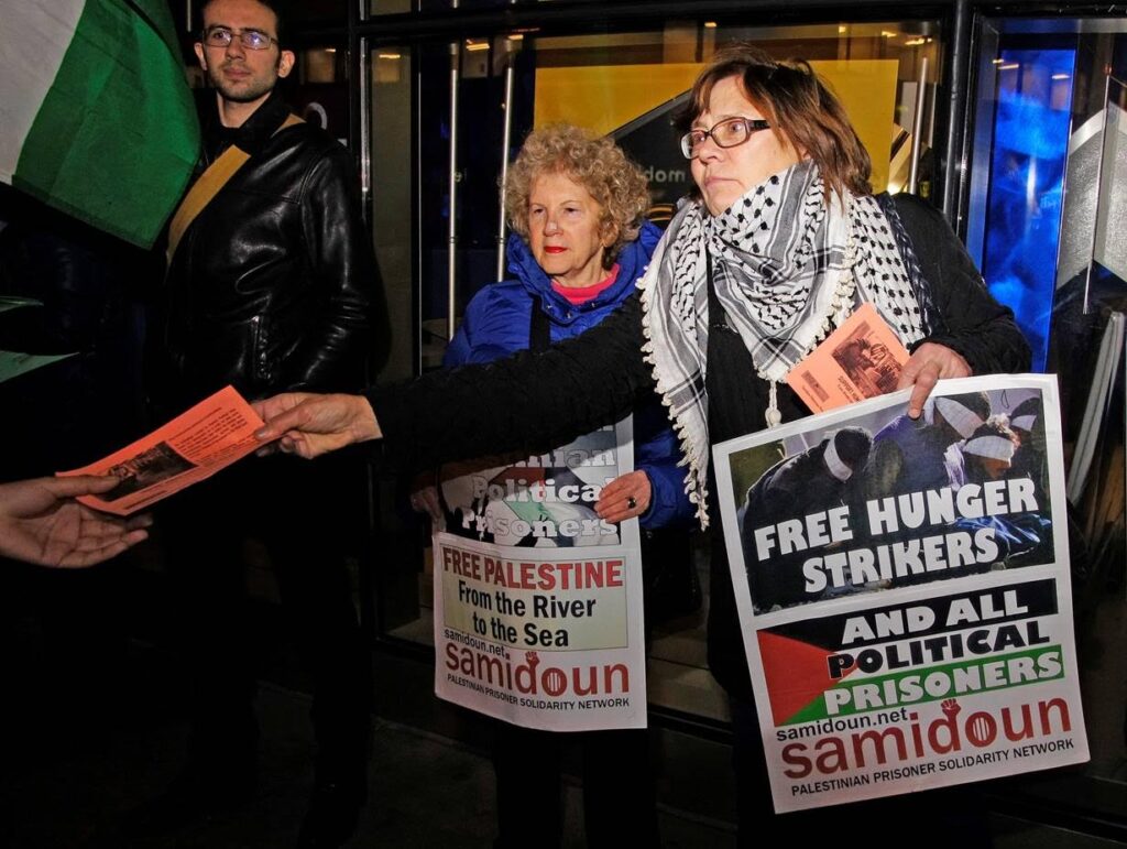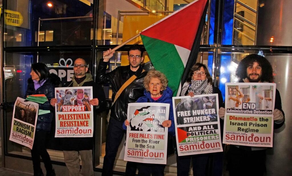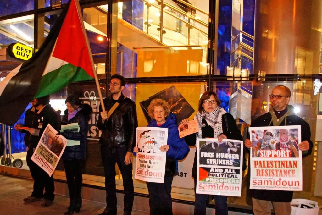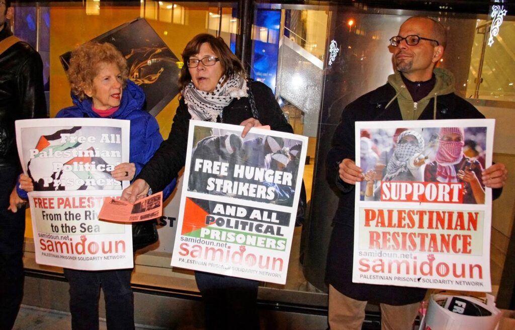 New Yorkers gathered on Monday, 20 November to protest in solidarity with Palestinian prisoners on hunger strike in Israeli prisons. Organized by Samidoun Palestinian Prisoner Solidarity Network, the protesters distributed flyers and information about the hunger strikes of Hamza Marwan Bouzia and Salah Khawaja as well as the growing international campaign to boycott Hewlett-Packard (HP) corporations for profiteering from the occupation, oppression, imprisonment and colonization of Palestine and the Palestinian people.