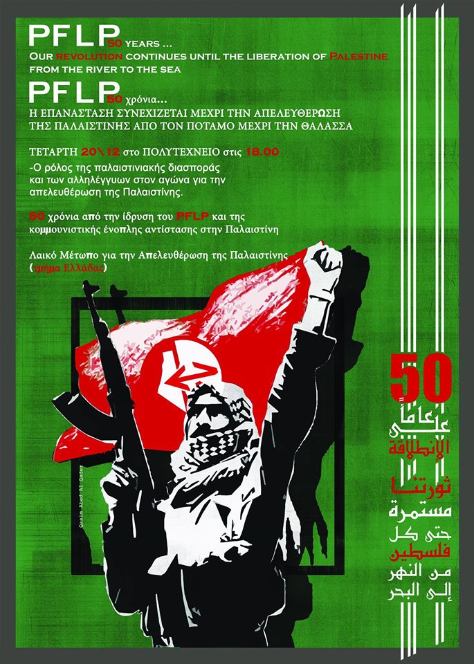 Σε αυτό το περιβάλλον αγώνα και καθώς ο παλαιστινιακός λαός κλιμακώνει τη νέα του Ιντιφάντα, καλούμε όλους τους υποστηρικτές της Παλαιστίνης και του παλαιστινιακού λαού να παραστούν στην 50ή επέτειο του Λαϊκού Μετώπου για την Απελευθέρωση της Παλαιστίνης στην Αθήνα, καθώς προετοιμαζόμαστε για άλλα 50 χρόνια αγώνα προς τη νίκη, την επιστροφή και την απελευθέρωση.